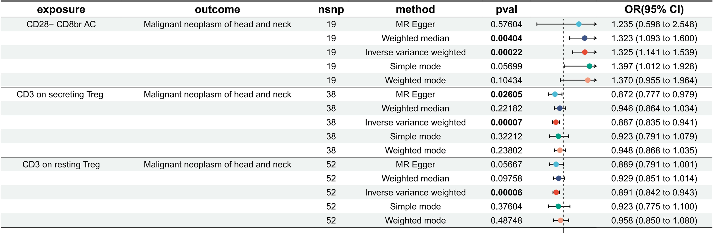 Subsequent to false discovery rate (FDR) correction, three immune cell phenotypes were found to have a significant correlation with the risk of HNMN: CD28−CD8+ absolute cells (AC) (inverse-variance weighted [IVW] using the multiplicative random effects model: OR [95%]: 1.325 [1.413 to 1.539], P = 0.0002, Pfdr = 0.054), CD3 on secreting Treg (IVW: OR [95%]: 0.887 [0.835 to 0.941], P = 0.00007, Pfdr = 0.025), and CD3 on resting Treg (IVW: OR [95%]: 0.891 [0.842 to 0.943], P = 0.00006, Pfdr = 0.026). The results of the sensitivity analysis were aligned with the primary findings. No statistically significant effects of HNMN on the immunophenotypes were observed.