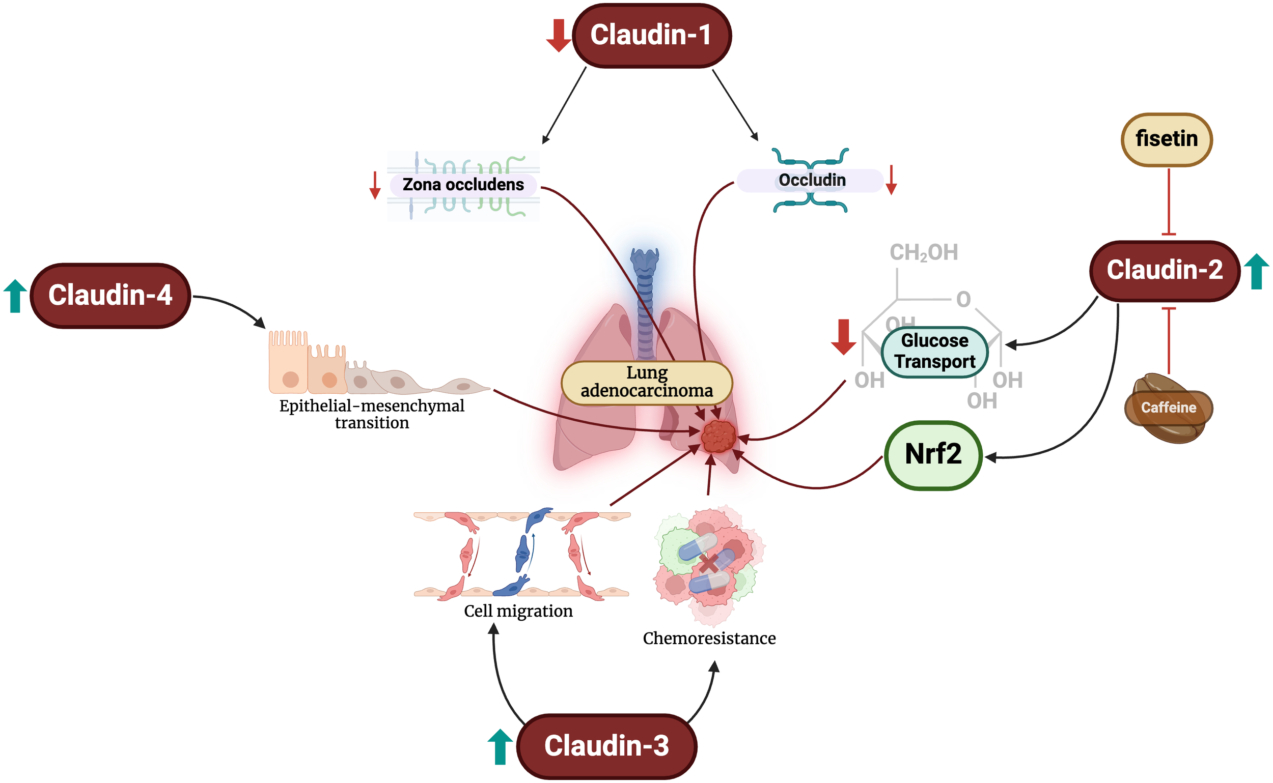 Changes in claudin levels promote the development of LUAD through different mechanisms. Firstly, reductions in claudin-1 levels lead to decreased expression of zona-occludens and occludin. Increased claudin-2 levels blunt glucose transport and activates Nrf2. Furthermore, claudin-3 overexpression promotes malignant cell migration and chemoresistance. Finally, claudin-4 exacerbates epithelial-mesenchymal transition, an important step in oncogenesis.