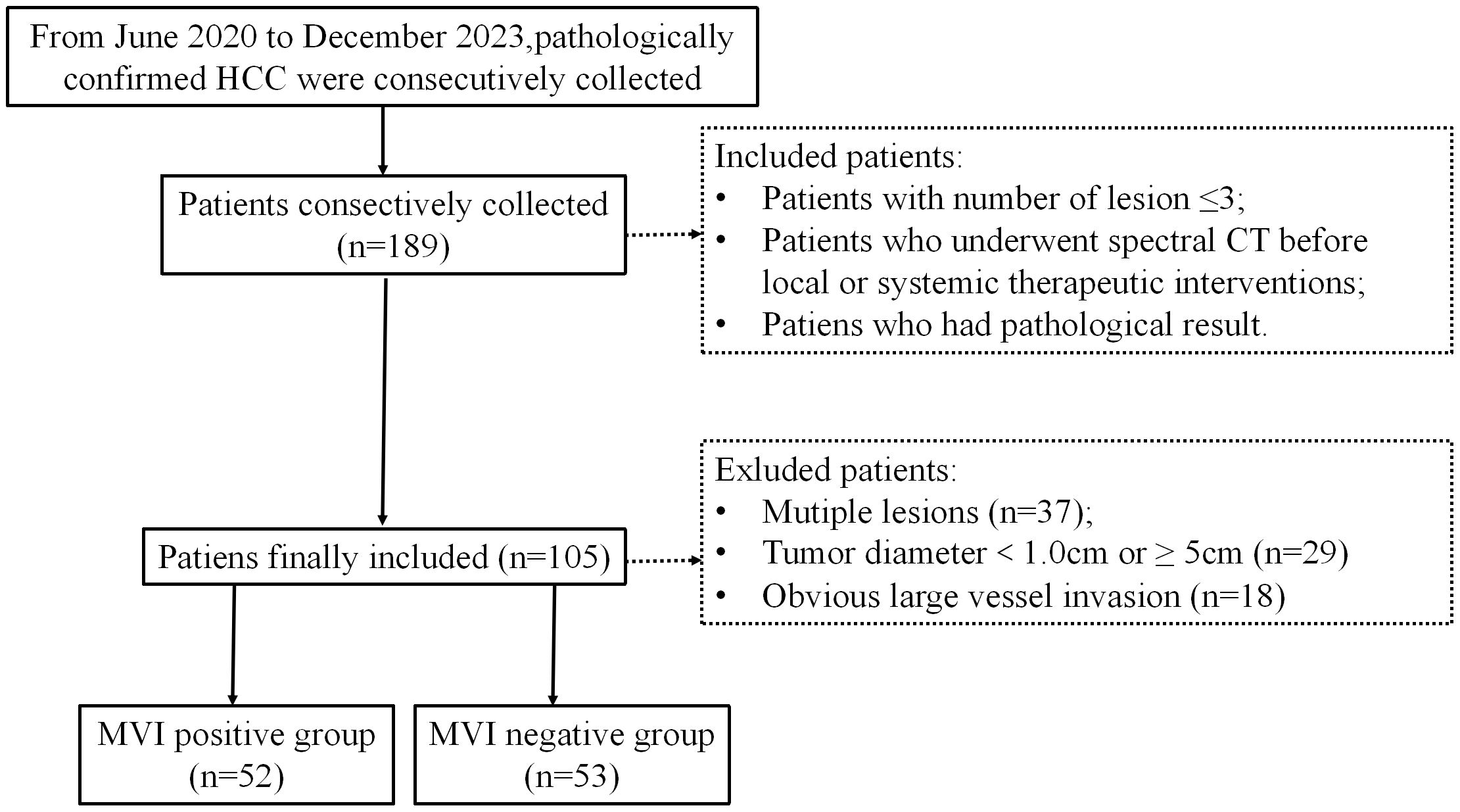 This is a retrospective study conducted at Nanxishan Hospital of Guangxi Zhuang Autonomous Region. Between June 2020 and July 2023, a total of 105 cases of HCC were collected, confirmed through pathological examination with surgical specimens in a consecutive manner. All patients had undergone spectral CT examination within 1 week before surgery. The inclusion and exclusion criteria for this study were detailed in Figure 1. The study was conducted in accordance with the Declaration of Helsinki (as revised in 2013). This study has been approved by the Ethics Committee of Nanxi Mountain Hospital, Guangxi Zhuang Autonomous Region [NO.2020 (KY-E-37)]. Due to its retrospective study, the requirement for informed consent is waived.