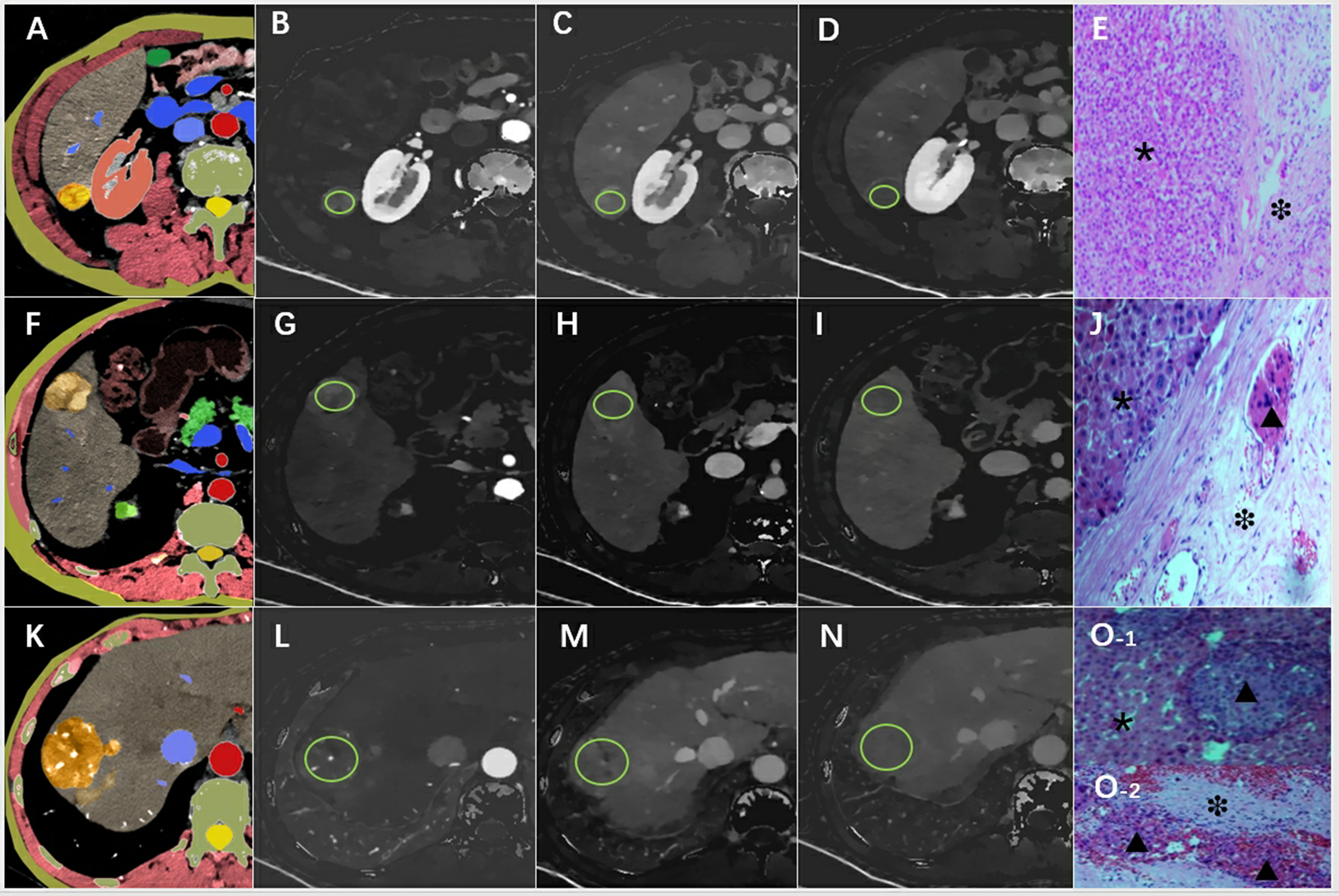 An example of the definition of the regions of interest. Examples of the definition of the regions of interest (ROIs) (light green circles) for quantitative analyses. (A) Schematic diagram of hepatocellular carcinoma with smooth tumor margin, (B) ID-A=1.02 mg/ml, (C) ID-P=1.23 mg/ml, (D) ID-D=1.05 mg/ml, (E) pathological pictures (×200), the tumor area (*) and MVI-negative in the normal area (❉) around the tumor were marked. (F) Schematic diagram of hepatocellular carcinoma with nodule-in-nodule architecture, (G) ID-A=1.87 mg/ml, (H) ID-P=1.58 mg/ml, (I) ID-D=1.32 mg/ml, (J) pathological pictures (×200) showed the tumor area (*) and MVI-positive(▴) in the normal area(❉) around the tumor. (K) Schematic diagram of hepatocellular carcinoma with corona enhancement, (L) ID-A=1.64 mg/ml, (M) ID-P=1.43 mg/ml, (N) ID-D=1.02 mg/ml, (O) pathological pictures (×200), O-1 shoued MVI-positive (▴) in the tumor (*), and also combined with MVI-positive (▴) in normal area (❉) in the O-2. ID-A, iodine density in hepatic arterial phase; ID-P, iodine density in portal-venous phase; ID-D, iodine density in delayed phase.