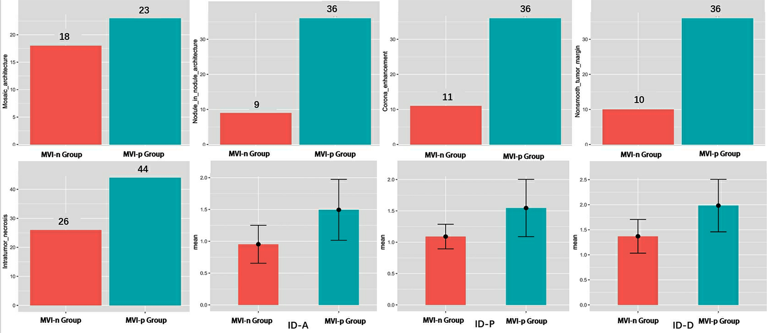 Analysis of differences in variables between two groups. MVI, microvascular invasion; ID-A, iodine density in hepatic arterial phase; ID-P, iodine density in portal-venous phase; ID-D, iodine density in delayed phase.