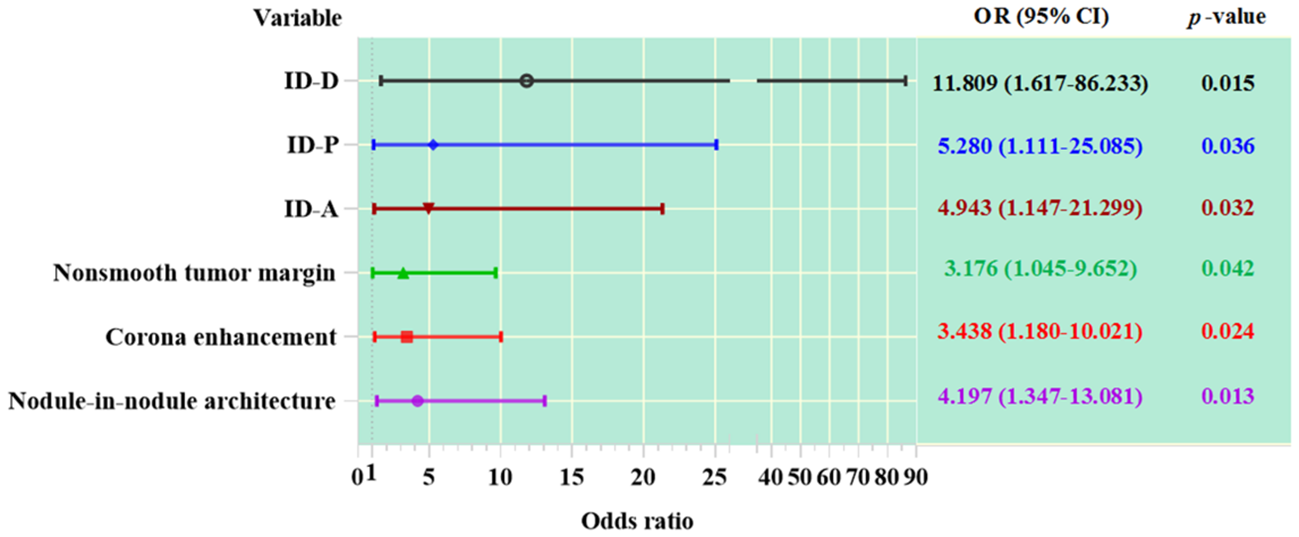 Valuable insights from the analysis reveal that nodule-in-nodule architecture, corona enhancement, and nonsmooth tumor margin, as part of the general imaging features, exhibit significant diagnostic efficacy, boasting respective AUC of 0.761, 0.742, and 0.752. These imaging feature variables demonstrate notable sensitivity and specificity levels alongside significant p-values. Specifically, the diagnostic sensitivity for nodule-in-nodule architecture, corona enhancement, and nonsmooth tumor margin was 0.692, 0.692, and 0.692, respectively, while their diagnostic specificity values were 0.830, 0.792, and 0.811 correspondingly.