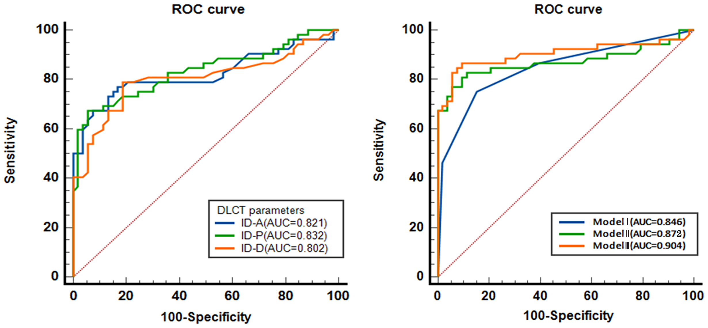 Statistical analyses were conducted using SPSS 26.0 (IBM Corp., Armonk, NY, USA). A bilateral p-value of less than 0.05 was considered indicative of statistical significance. The intraclass coefficient coefficient (ICC) test was utilized to assess the consistency of the ROI measurements made by both radiologists. Intraobserver agreements of imaging features were evaluated using Cohen κ-statistics. The strength of agreement via ICC and κ values < 0.4, 0.4–0.6, 0.6–0.8, and > 0.8 were categorized poor, moderate, good, and excellent agreement, respectively (13). The means of the variables measured by the two radiologists were utilized for statistical analysis. Normality and homogeneity of variance were tested using the Shapiro-Wilk test. Count data were presented as cases, and differences between groups were assessed using the chi-square test. Measurement data with a normal distribution were expressed as mean ± standard deviation and were compared between groups using an independent samples t-test, with post-hoc tests corrected using Bonferroni adjustment. Binary logistic regression analysis was employed to investigate the association between baseline spectral CT parameters and the presence of MVI. Initially, variables showing statistical associations were identified through binary logistic regression. Subsequently, variables with a p-value less than 0.05 were included in the multivariable logistic regression model to determine combined predictive parameters. Three prediction models were developed based on these combined parameters: Model I using imaging features, Model II based on spectral CT variables (including ID values on arterial, portal, and delayed phase images), and Model III incorporating both imaging features and spectral CT parameters. The diagnostic performance of spectral parameters and the three combined models was assessed using the receiver operating characteristic curve (ROC). Area under the curve (AUC) values, cutoff values, sensitivity, and specificity were calculated based on the optimal Youden index. Additionally, the DeLong test was employed to compare the AUC differences among the variables and models.