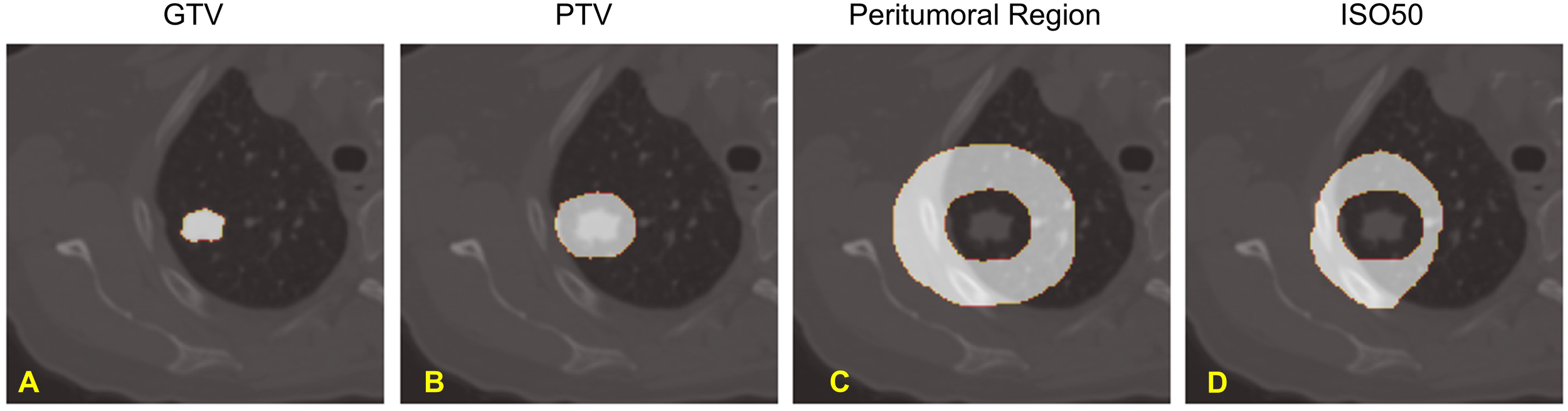 Volumes of Interest of our study: (A). Gross Tumor Volume (GTV), (B). Planning Target Volume (PTV), (C). Peritumoral Region, and (D). Normal Tissue receiving greater than 50% of Prescription Dose - ISO50.