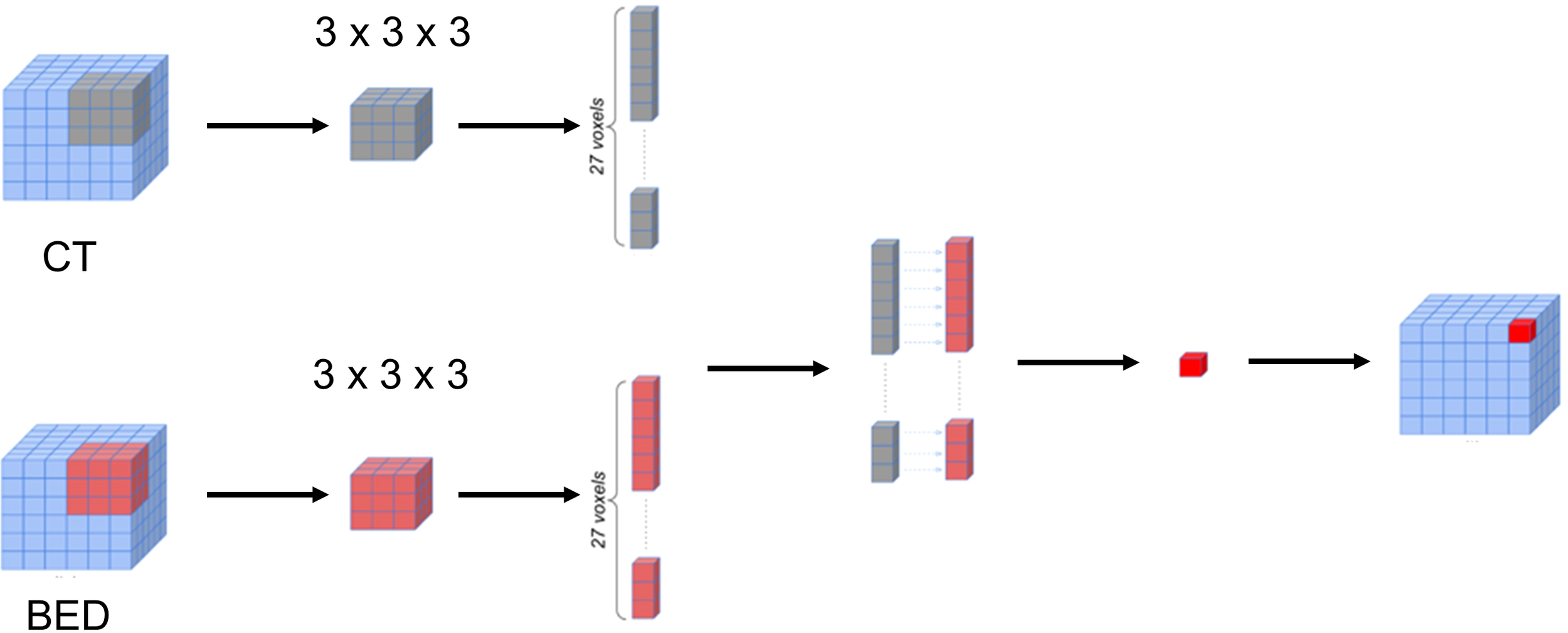 The BED matrix and the planning CT image matrix exhibit a point-to-point correspondence. Specifically, each voxel within the BED matrix corresponds to a voxel within the CT image matrix with the same coordinates, representing the dose received by the tissue in the corresponding voxel of the CT image matrix. To delve deeper into the potential features concealed within the relationship between the CT image matrix and the BED matrix, we generated a series of interaction matrices to depict the interrelationship between the CT image and the Biological Effective Dose (BED). Specifically, we extracted a pair of three-dimensional patches (3 x 3 x 3) surrounding each voxel in both the CT image matrix and BED matrix. Subsequently, we computed various metrics, including Entropy, Spearman Rank Coefficient, Jensen-Shannon Divergence (JSD), and Wasserstein distance between these two patches (CT and BED). Each of these metric values was then recorded within an empty matrix, preserving the spatial alignment with the original voxel location within the CT image matrix. Figure 3 illustrated the process of calculating the 3-D interaction matrices between CT image and BED. In addition, we also calculated a pair-wise multiplication matrix between the CT image and the BED dose matrix.