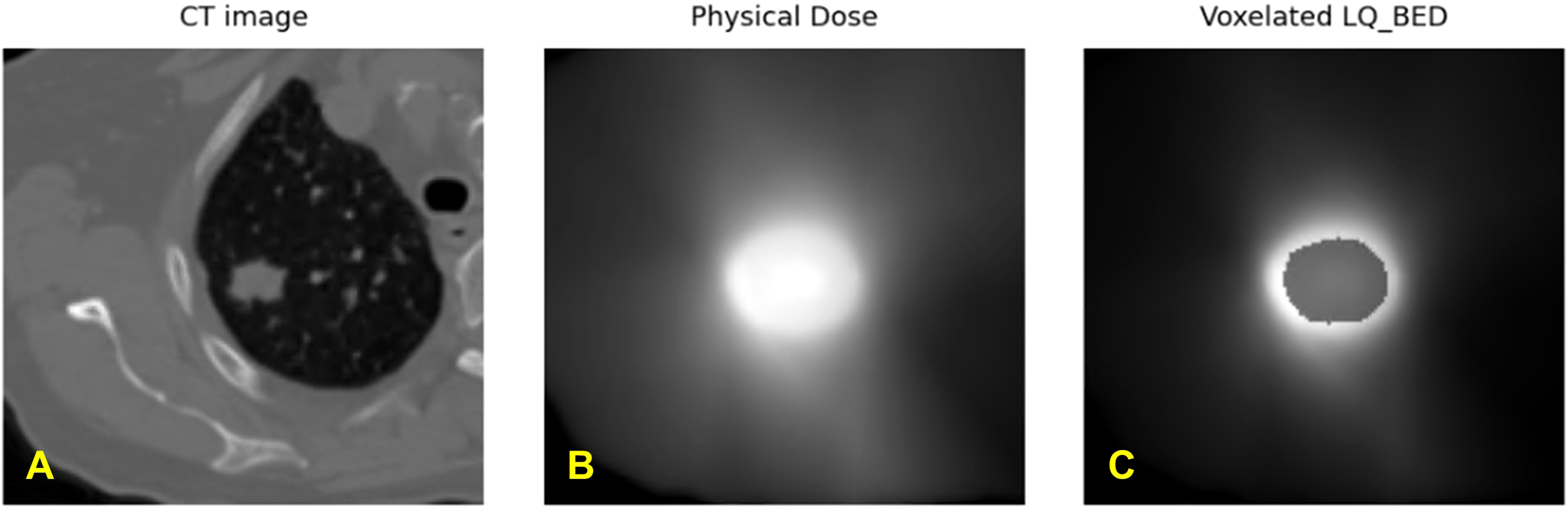Exemplary representation of (A) planning CT image, (B) physical dose distribution extracted directly from the treatment plan, and (C) calculated biologically effective dose (BED) distribution from one patient.