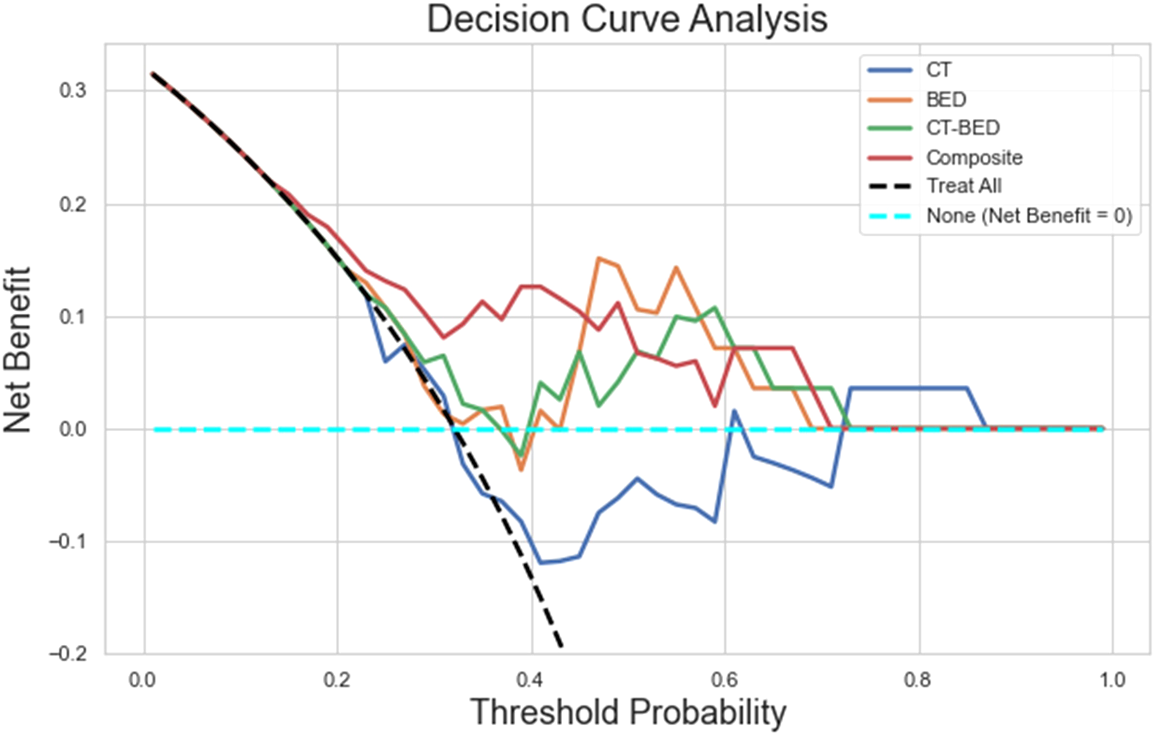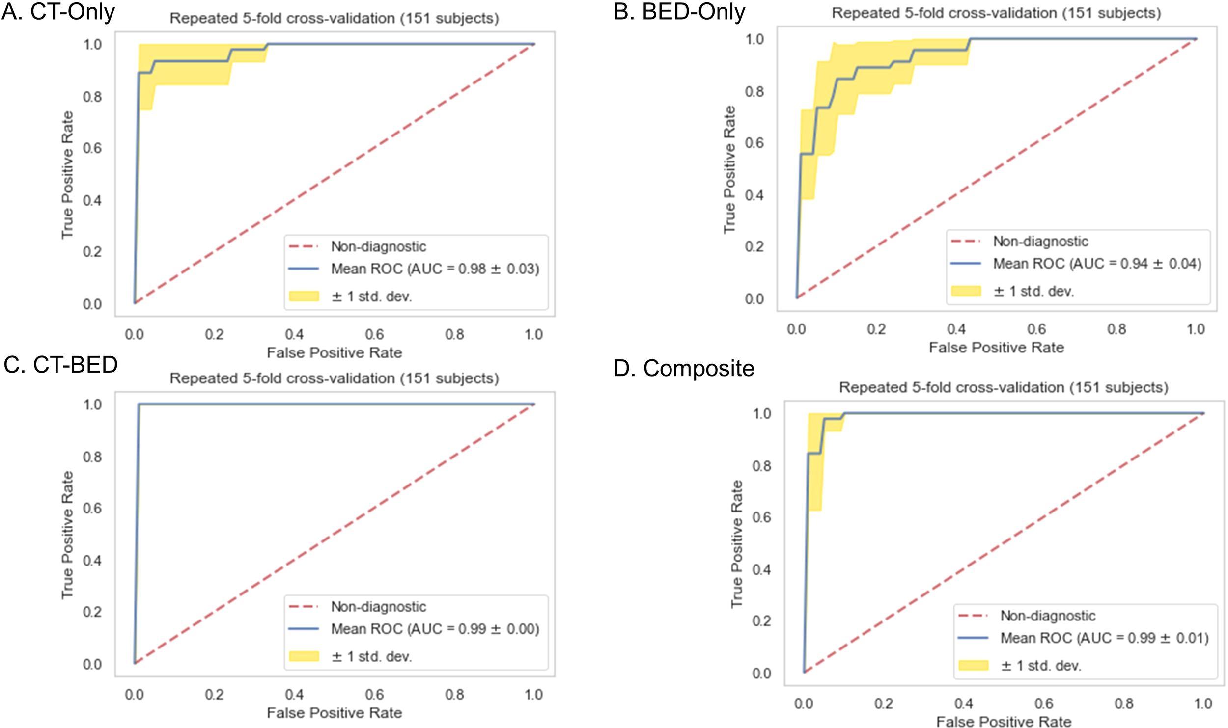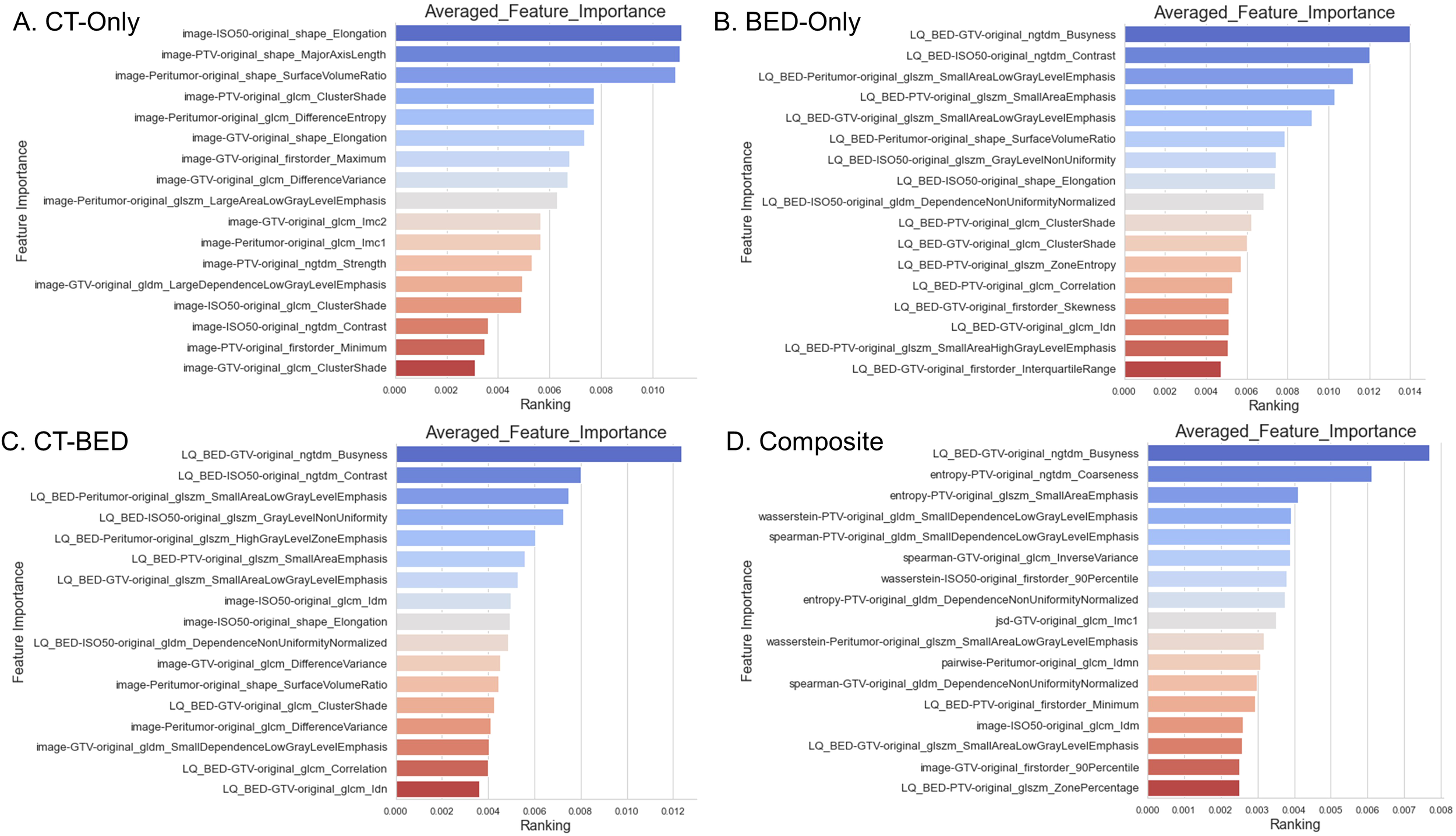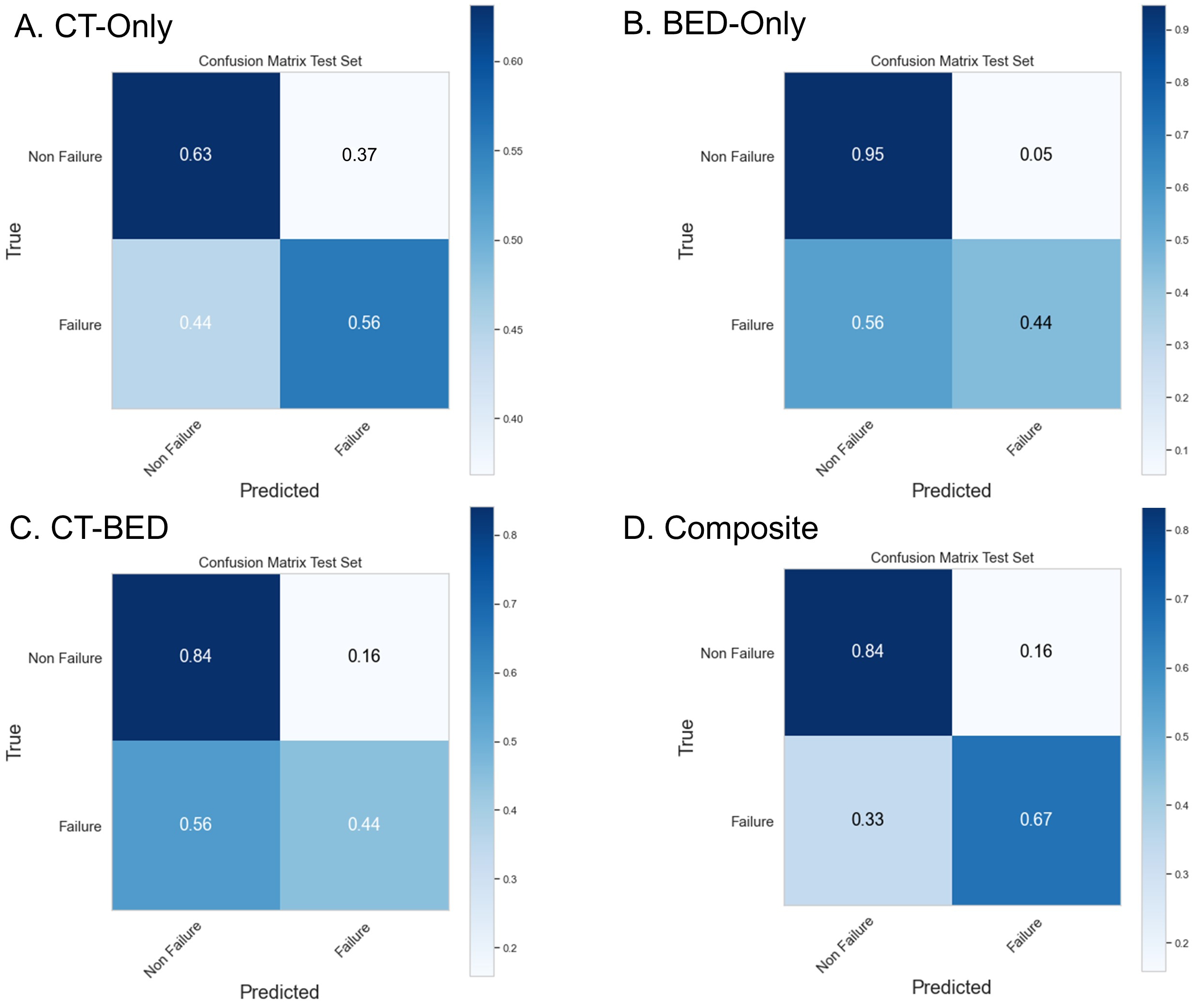 The cohort included 125 non-failure cases and 54 failure cases, with a median follow-up time of 34.4 months. We selected the top 17 important and non-redundant features (with the Pearsons’s coefficient < 0.5) in each model. When evaluated on the same independent test set, the four models—CT features-only, BED features-only, a combination of CT and BED features, and a composite model including features from CT and BED that includes their interaction matrices—achieved AUC values of 0.56, 0.75, 0.73, and 0.82, respectively, with corresponding accuracies of 0.61, 0.79, 0.71, and 0.79. The composite model demonstrated the highest AUC and accuracy, indicating that incorporating interactions between CT and BED reveals more predictive capabilities in distinguishing between failure and non-failure cases.