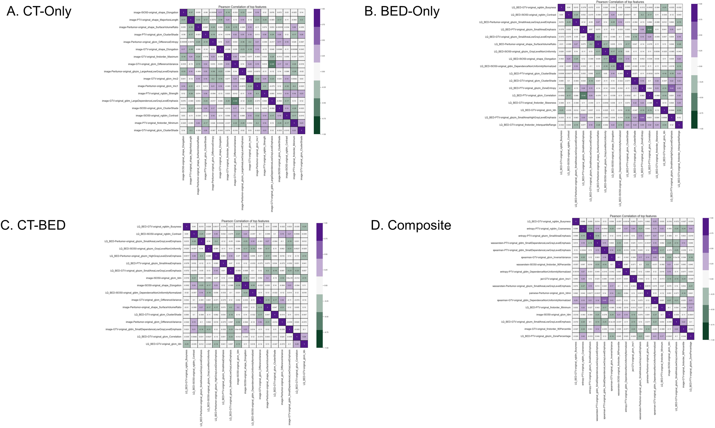 Following the feature extraction, we selected the important and non-redundant features from the features extracted from the CT image, BED and the calculated interaction matrices using our in-house feature selection pipeline that has been previously reported (34, 35). The feature selection pipeline consists of two main steps: quantifying feature importance and identifying non-redundant features. Feature importance is determined through repeated 5-fold cross-validation using various classification algorithms from the training dataset (151 cases), including Random Forest, Extra Trees, AdaBoost, and XGBoost. The final importance score for each feature is the average of the scores from all algorithms. Pearson’s correlation coefficient was then calculated among these features in descending order to identify non-redundant features, with the top-ranked feature automatically considered non-redundant. For each subsequent feature, if the Pearson coefficient with any previously identified non-redundant feature exceeds 0.5, it is deemed redundant and discarded.