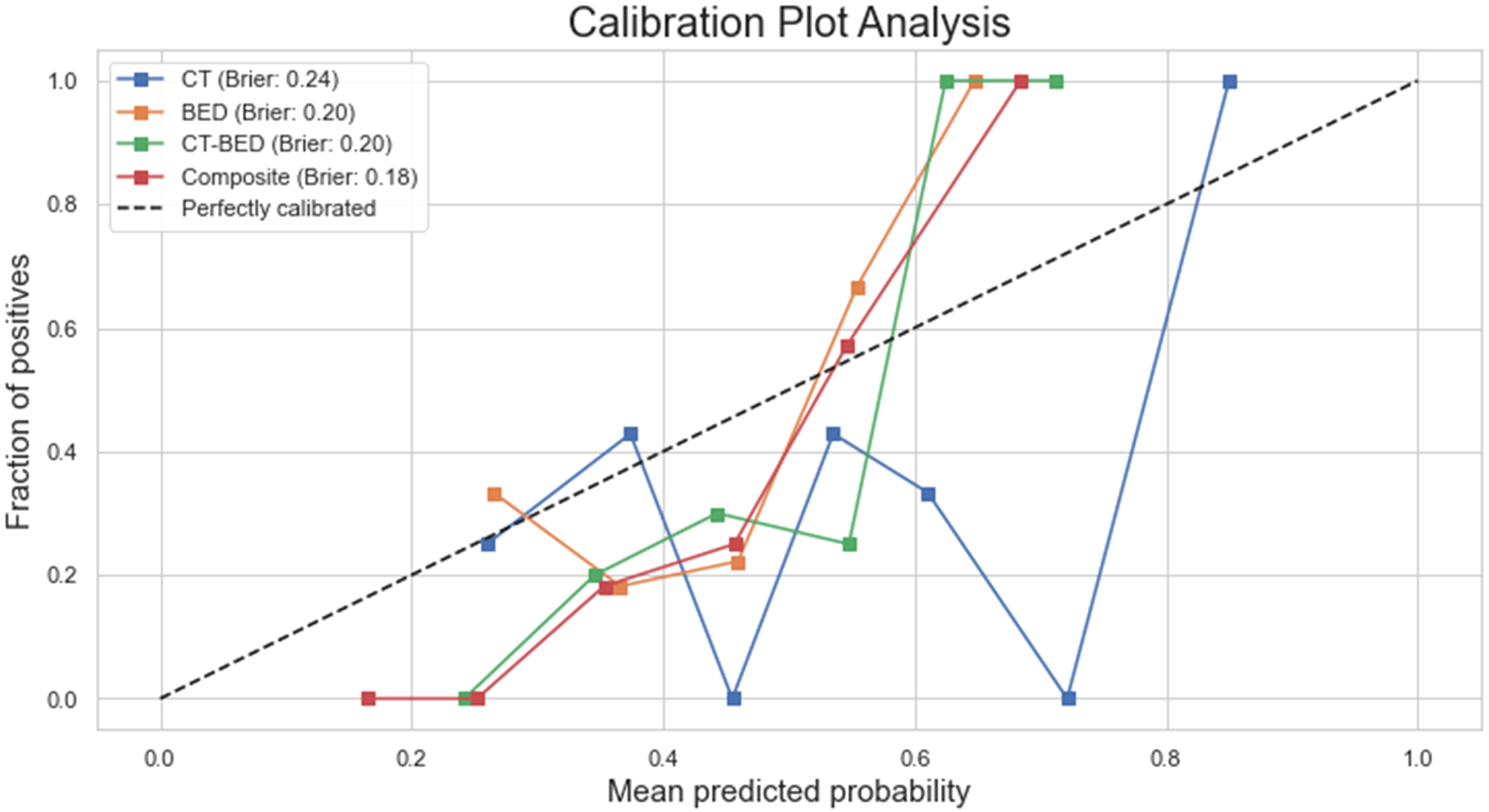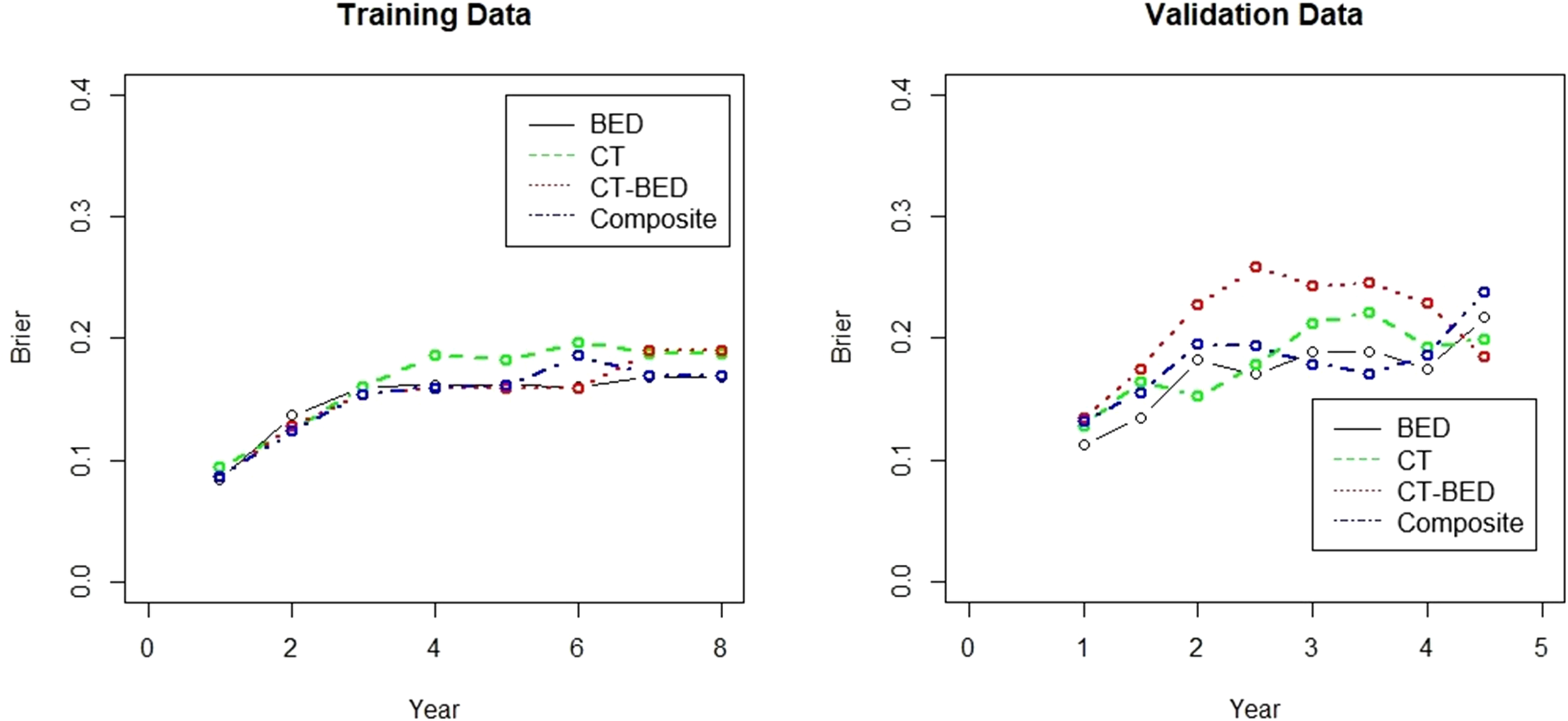 The Fine-Gray model (38) was used to predict the cumulative incidence of having treatment failure using the features identified by the four considered models, including CT-only, BED-only, a combination of CT and BED, and a composite of CT and BED including their interaction matrices, separately. The concordance index (c-index) was estimated to assess the models’ ability to separate individuals with treatment failure earlier than others. The c-index value ranges between 0 and 1, and a value of 0.5 suggests no discriminating ability, and a value of 1 suggests perfect discriminating ability. The Brier score was evaluated to assess both calibration (i.e. how close the prediction is to the true underlying risk of event) and discrimination. A smaller Brier score indicates a better model. The integrated Brier score (IBS) was calculated to integrate the Brier score values obtained at all follow up times to assess the overall performance of the considered models. The competing risk analyses using the prodlim, riskRegression, and pec packages of R statistical software (R version 4.4.1, http://www.r-project.org).