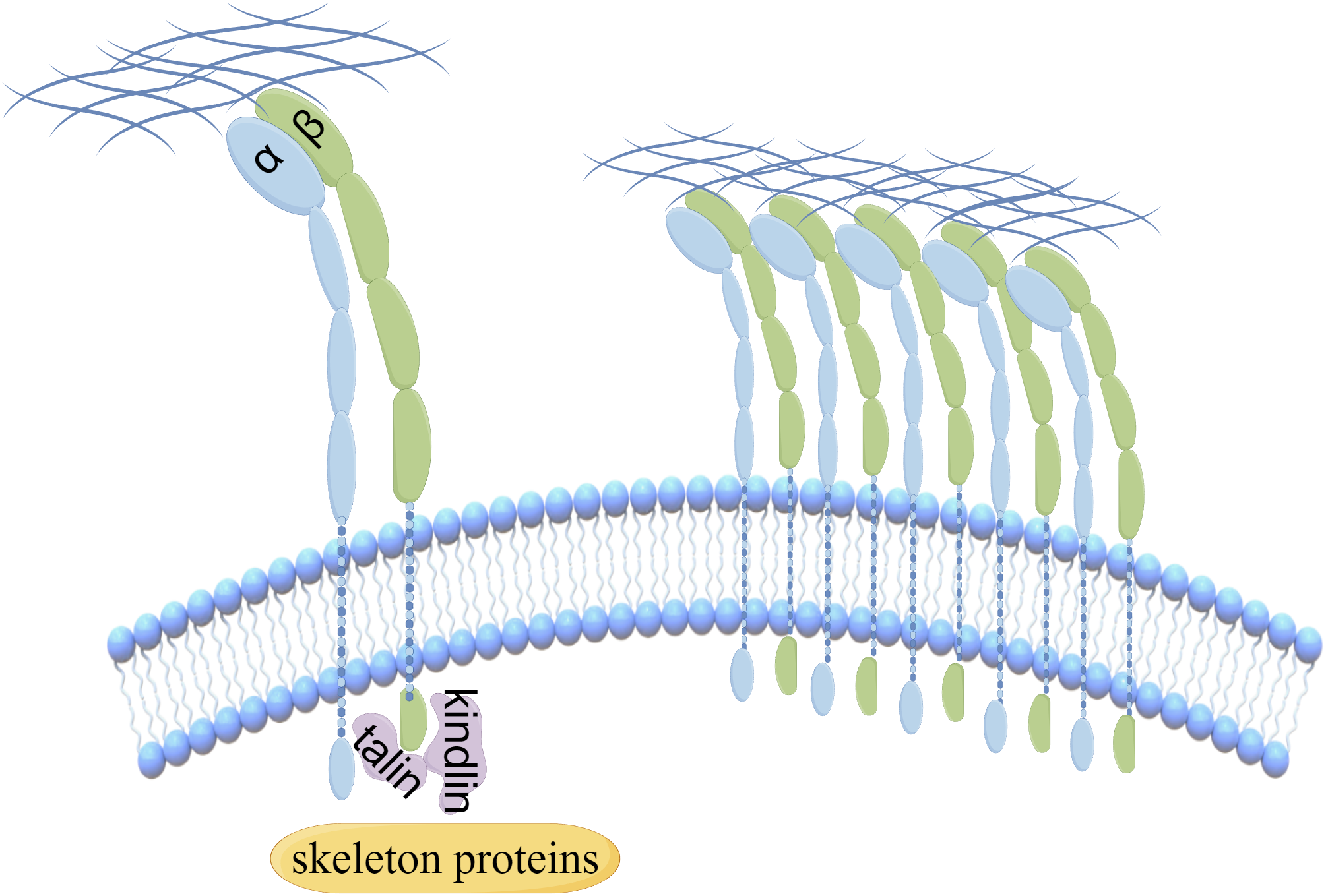 The aggregation of integrins is regulated by the interaction of intracellular regulatory proteins.