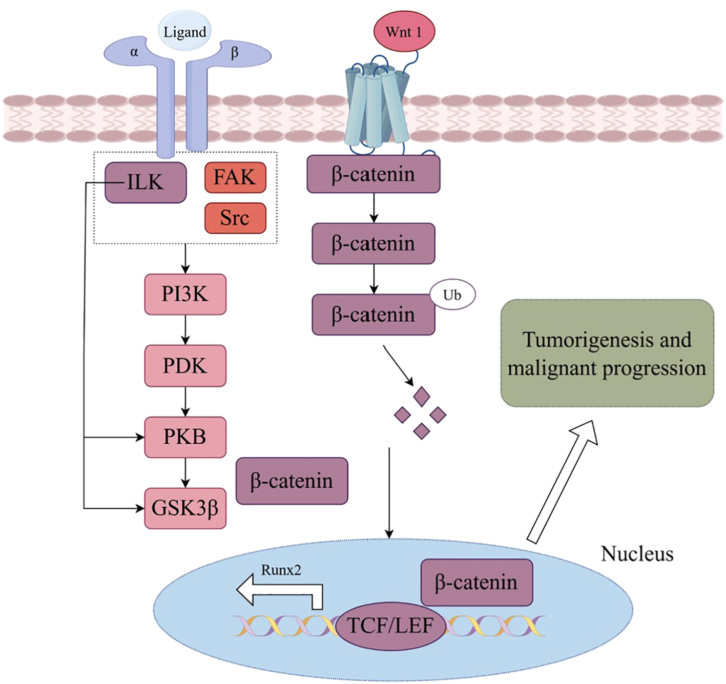 Wnt signaling in integrin triggers phosphatidylinositol 3 kinase (PI3K) activation, subsequently regulating glycogen synthase kinase 3β (GSK3β), ubiquitin (Ub)induced β-catenin degradation, nuclear location and Wnt targeting gene expression, which leading to tumorigenesis and malignant progression. (By Figdraw.).