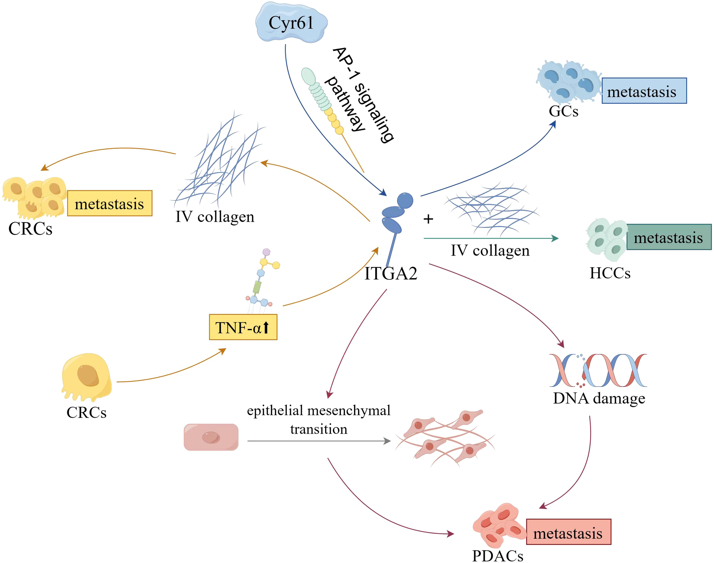 In summary, ITGA2 plays a pivotal role in digestive cancers, exerting influence on cancer initiation, metastasis, resistance to chemotherapy, and genomic instability. Nevertheless, the precise biological function and regulatory mechanism of ITGA2 in the TME remain inadequately supported by robust evidence. In the future, employing advanced scientific methodologies, a comprehensive understanding of ITGA2 impact on diverse cell types within the TME can be elucidated. Consequently, targeting ITGA2 could potentially serve as a novel therapeutic approach to enhance therapies modulating/targeting the reprogram of the TME.