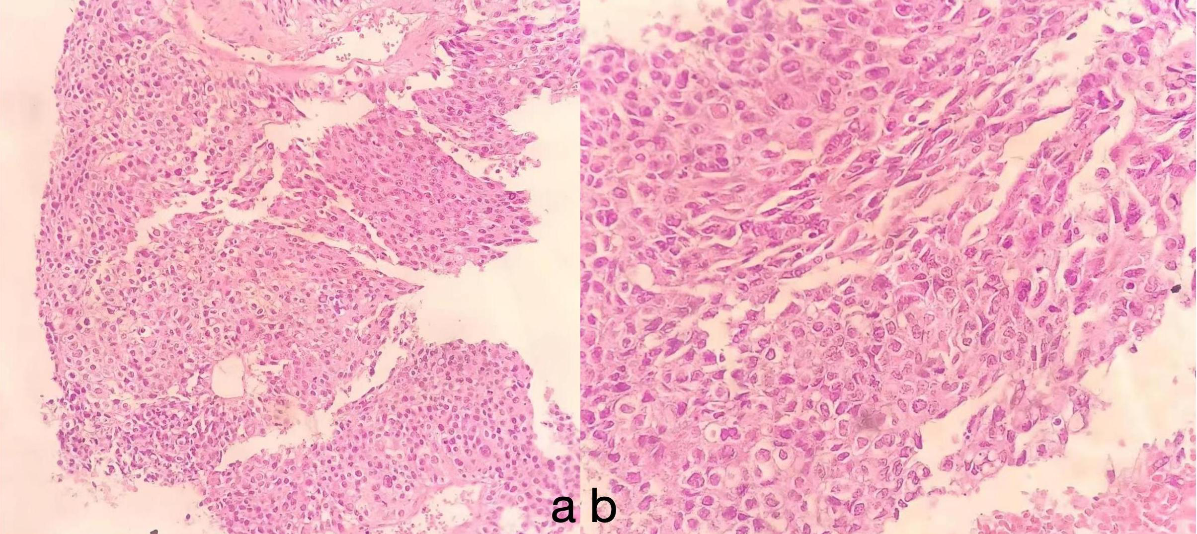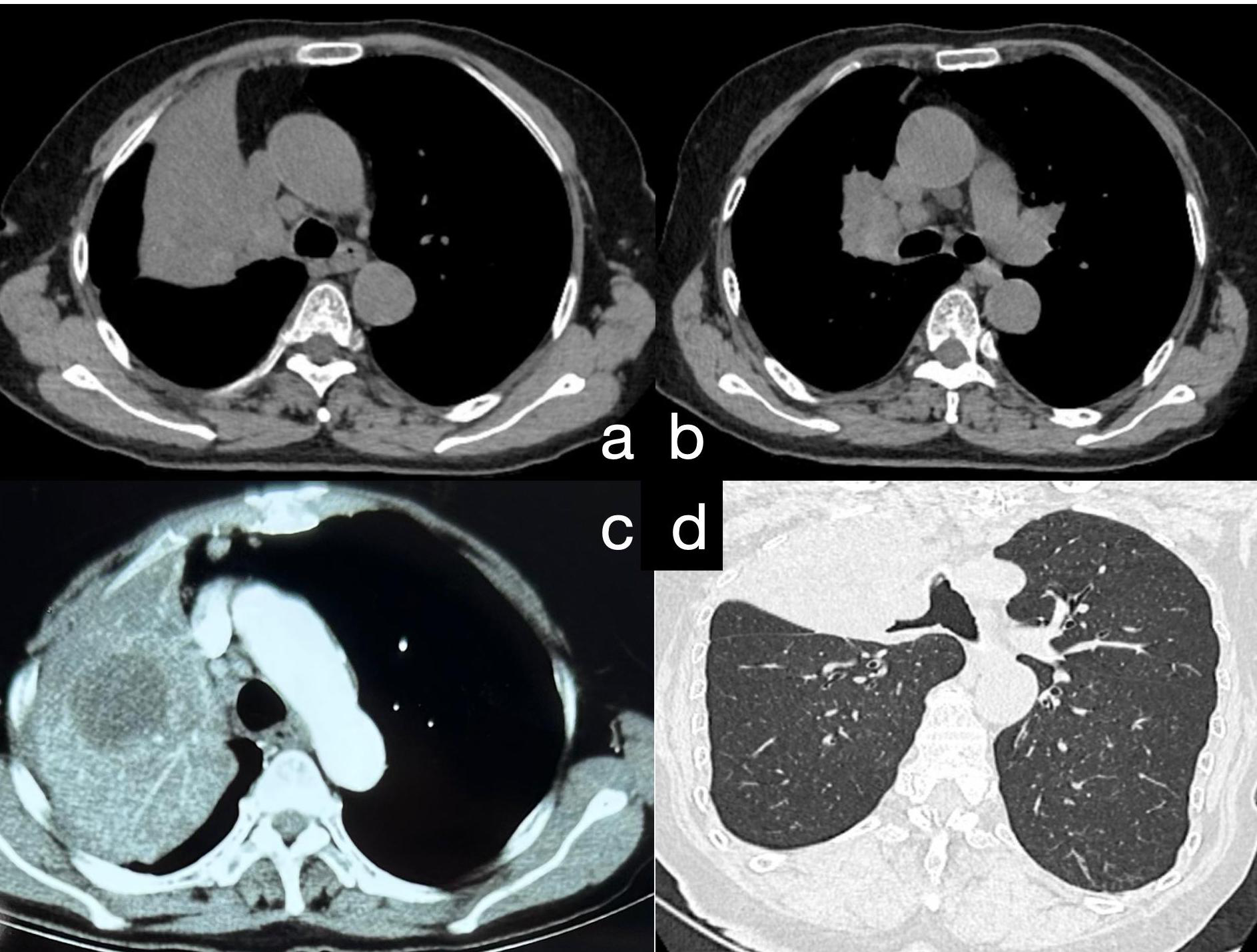 The imaging features of HAL are nonspecific and lack typical characteristics. Most lesions are large (3.5–11 cm) and present primarily in the upper lobes, near the pleura or mediastinal pleura, often adjacent to the chest wall or major blood vessels (10). Enhanced CT typically shows necrotic changes (11), which is easily confused with pulmonary tuberculosis (12). Our patient underwent a CT-guided percutaneous lung biopsy at another hospital, which was suggestive of inflammation, although subsequent special stains for inflammation were negative. We noted a low-density area within the lesion center, possibly indicative of necrosis, which could lead to noninfective inflammation consistent with the characteristics of HAL. We speculate that the tissue obtained during her first biopsy might have originated from this necrotic zone, resulting in a false-negative outcome. However, serum marker testing or immunohistochemistry of lesion tissue can aid differentiation. Our patient’s CT showed a large lesion (10.7 cm) in the right upper lobe with central necrosis, typical of HAL. In the initial biopsy, necrotic tissue was likely obtained, causing a misdiagnosis, while solid tumor tissue was successfully obtained in the second biopsy.
