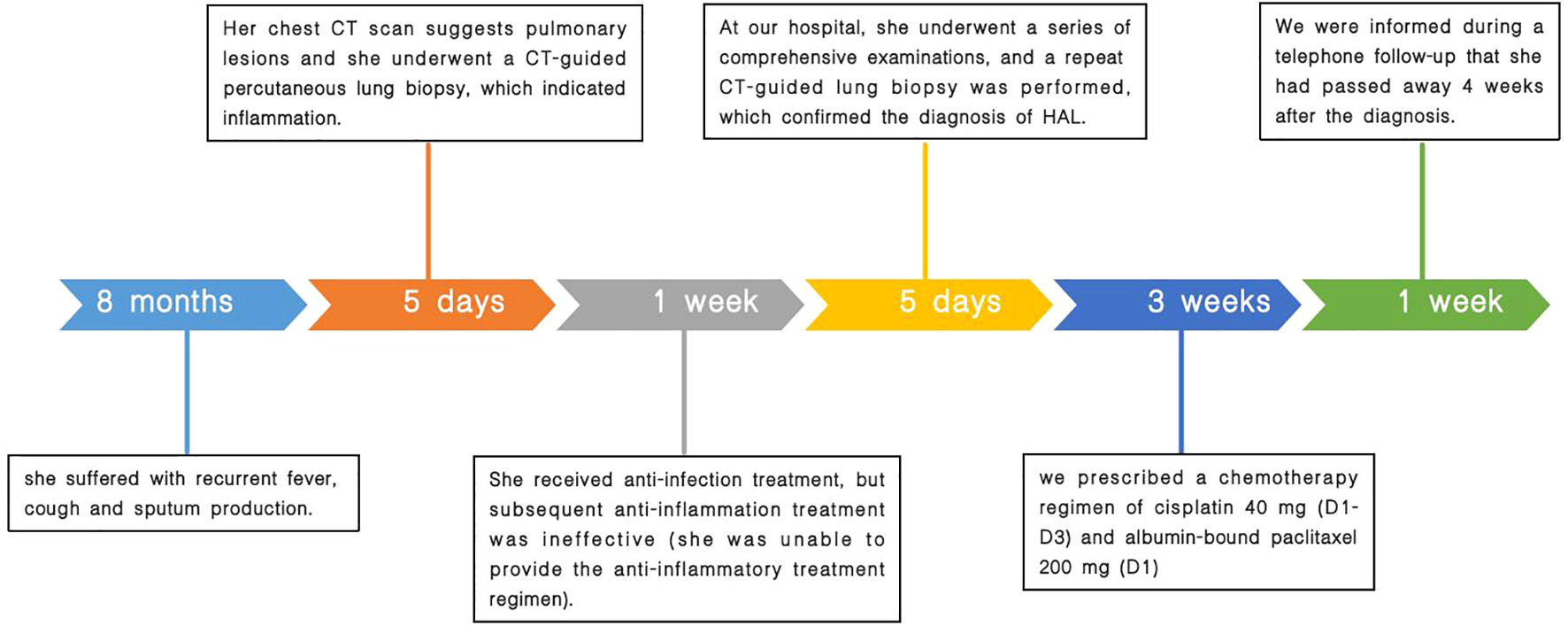 Based on the current lack of comprehensive treatment guidelines and our literature review, we considered the patient to have missed the optimal timing for surgery. Therefore, we recommended genetic testing of the lesion to evaluate the possibility of targeted drug therapy. We also offered radiation therapy and immunotherapy options. However, the patient could not afford genetic testing and immunotherapy and rejected the offered radiation therapy plan. Finally, according to the literature review (3, 4), we prescribed a chemotherapy regimen of cisplatin at 40 mg (D1–D3) and albumin-bound paclitaxel at 200 mg (D1), informing the patient that chemotherapy alone may lead to less favorable treatment outcomes. Nevertheless, due to the patient’s poor compliance, she did not undergo the standard serological and radiological examinations after treatment. Upon follow-up, we discovered that she passed away 4 weeks after diagnosis. A comprehensive timeline of the patient’s diagnostic and treatment process is presented in Figure 4.