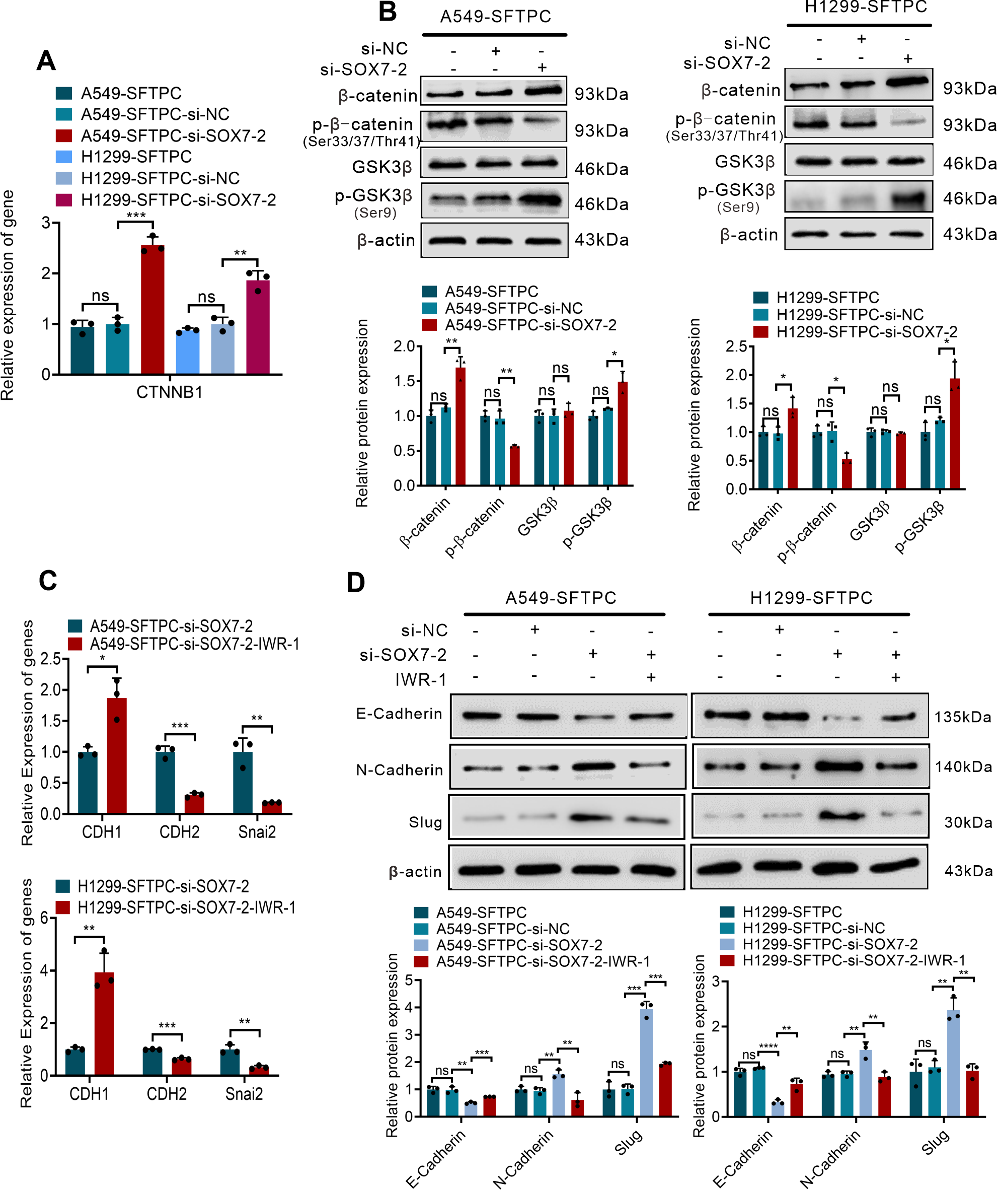Overexpression of SFTPC inhibited EMT process through upregulation of SOX7 and then inactivation of WNT/β-catenin pathway in vitro. (A) qRT-PCR assay was used to detect the mRNA level of CTNNB1(β-catenin). The histogram was applied to quantify the relative mRNA level. (B) Western blot assay was used to detect the protein levels of WNT/β-catenin pathway markers by using primary antibodies against GSK3β, p-GSK3β(Ser9), β-catenin, p-β-catenin (Ser33/Ser37/Thr41) in indicated cells, and the histograms were applied to quantify the relative protein levels. (C) qRT-PCR assay was conducted on the indicated cells treated with IWR-1 (0.5μM) or without IWR-1 (n=3), the relative mRNA levels of EMT markers (CDH1(E-cadherin), CDH2(N-cadherin), Snai2(Slug) were detected. The histograms were applied to quantify the relative mRNA levels. (D) Western blot assay was conducted on the indicated cells treated with IWR-1 (0.5μM) or without IWR-1 by using primary antibodies against E-cadherin, N-cadherin and Slug (n=3), and the histograms were applied to quantify the relative protein levels. β-actin was used as the internal control gene. All the data were presented as the Mean ± SD, un-paired t-test. *p<0.05, **p<0.01, ***p<0.005, ****p<0.001. ns, no significance. All experiments were conducted a minimum of three times independently.