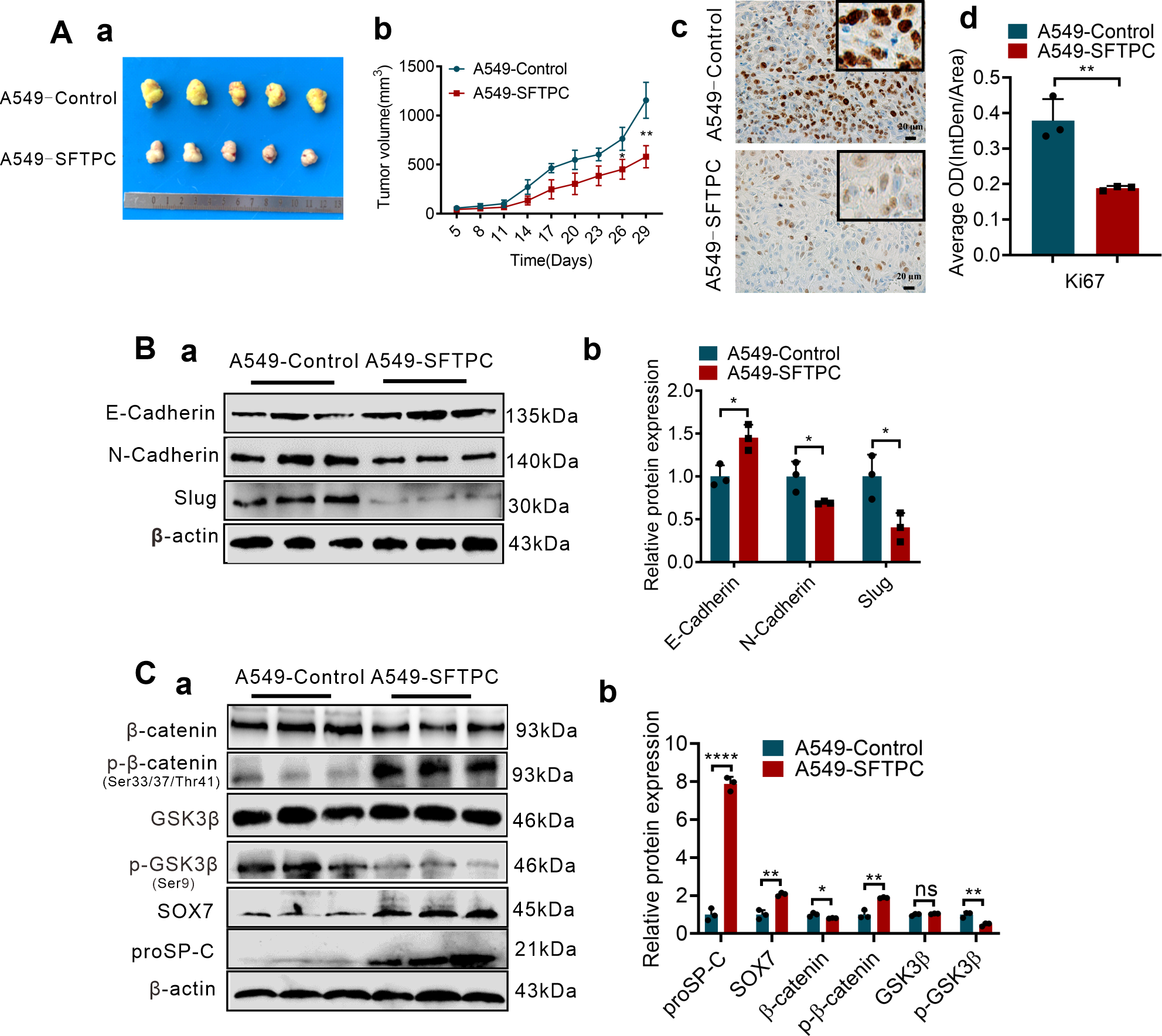 Overexpression of SFTPC inhibiting EMT process of NSCLC cells was associated with upregulation of SOX7 and inactivation of WNT/β-catenin pathway in vivo. (A) Establishment of stable SFTPC-overexpression A549 and control tumor xenograft models. BALB/c nude mice (4-week-old male, n=5/group) were subcutaneously injected with A549-SFTPC cells or A549-Control cells, respectively. The mice were sacrificed after 29 days, the retrieved tumor samples were showed in (a). The statistical graph of changes in tumor volume were showed in (b). IHC staining was conducted on paraffin sections of retrieved tumor samples by using primary antibody against the proliferation marker Ki-67 (n=3) (c), staining without primary antibody was used as negative control. Image J 180 was used to measure the average optical density. The histogram was applied to quantify the results of IHC staining (d). Scale bars, 20μm. (B) Western blot assay was conducted on the protein of retrieved tumor samples (n=3) by using the primary antibodies against E-cadherin, N-cadherin and Slug (a), and the histogram was applied to quantify the relative protein levels (b). (C) Western blot assay was conducted on the protein of the retrieved tumor samples (n=3) by using the primary antibodies against SOX7, proSP-C, GSK3β, p-GSK3β(Ser9), β-catenin and p-β-catenin (Ser33/Ser37/Thr41) (a), the histogram was applied to quantify the relative protein levels (b). β-actin was used as the internal control gene. All data were presented as the Mean ± SD, un-paired t-test. *p<0.05, **p<0.01, ****p<0.001. All experiments were conducted a minimum of three times independently.