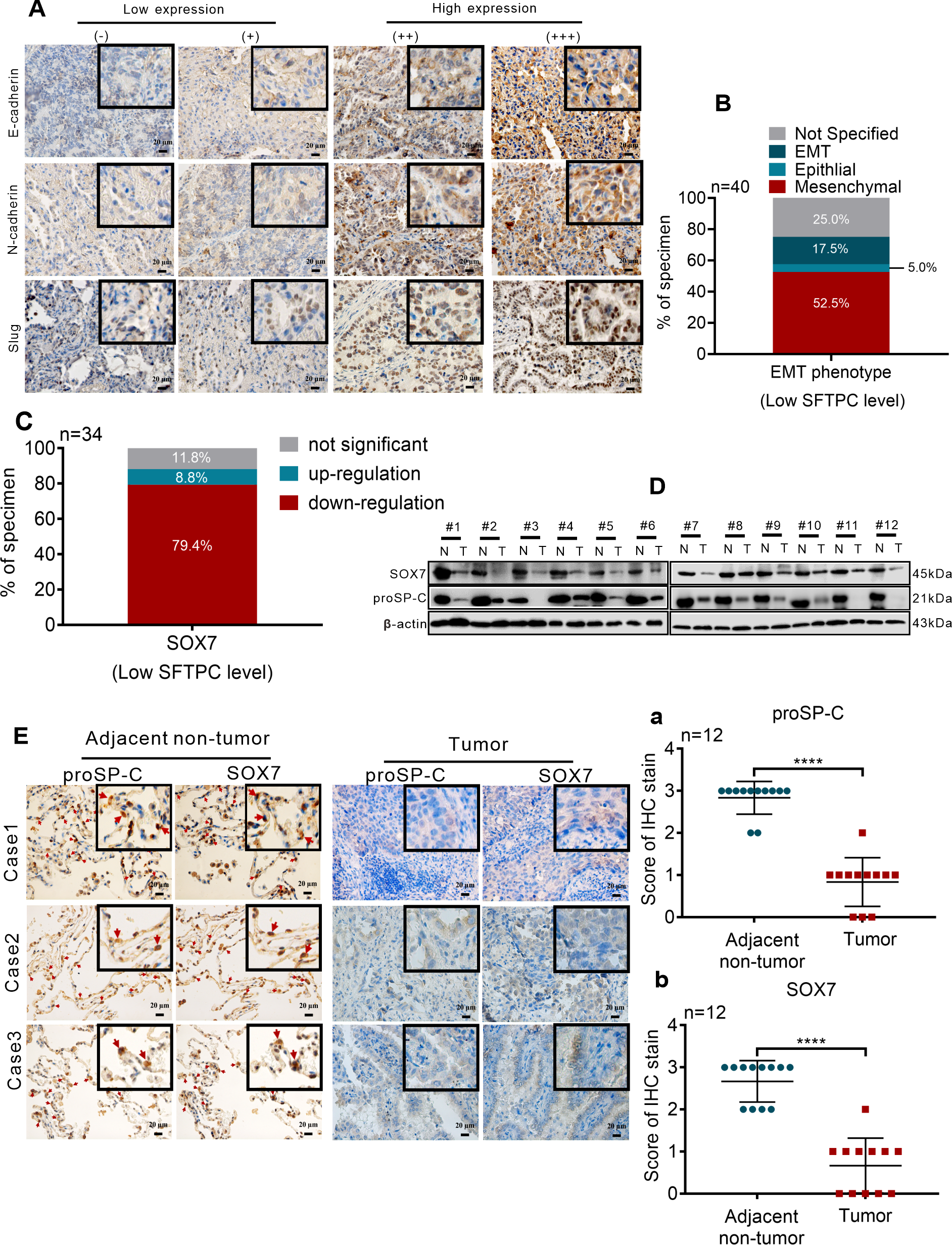 Low expression of SFTPC was correlated with the EMT process and low expression of SOX7 in clinical LUAD tissues (A) IHC staining was conducted on paraffin sections of collected clinical LUAD tumor tissues with low mRNA level of SFTPC (n=40) by using primary antibodies against E-Cadherin, N-Cadherin and Slug. Staining without primary antibody was used as negative control. The IHC staining yielded grades of E-Cadherin, N-Cadherin and Slug as follows, (-) and (+) represented low expression of EMT markers. (++) and (+++) represented high expression of EMT markers. Scale bar, 20μm. (B) The relationship between low expression of SFTPC and EMT phenotype status in LUAD tissues. (C) The mRNA levels of SOX7 in the collected clinical LUAD tumor tissues with low mRNA levels of SFTPC (n=34) were detected by qRT-PCR assay. (D) Western blot assay was conducted on the protein of paired clinical LUAD tumor tissues with both low mRNA levels of SFTPC and SOX7 (n=12) by using the primary antibodies against SOX7 and proSP-C. (E) IHC staining was conducted on the paraffin sections of the collected paired clinical LUAD tumor tissues with both low mRNA levels of SFTPC and SOX7 (n=12) by using primary antibodies against proSP-C and SOX7. Staining without primary antibody was used as negative control. And the site of SOX7 in alveolar (indicated by red arrow, adjacent non-tumor groups, right) was detected by IHC staining (n=12). The histograms were applied to quantify the experimental results of IHC staining (a, b). n, numbers of clinical tissues. Scale bar, 20μm. All data were presented as the Mean ± SD, un-paired t-test. ****p<0.001.