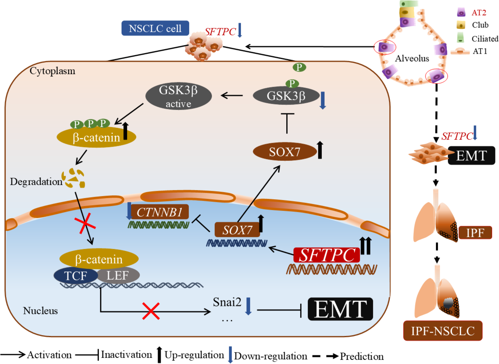 The molecular model of overexpression of SFTPC inhibiting the EMT process of NSCLC cells. Mechanistically, overexpression of SFTPC upregulated the expression of SOX7, then inhibited the mRNA level of CTNNB1(β-catenin) and decreased the protein level of p-GSK3β(Ser9), whereas increased the protein level of p-β-catenin (Ser33/Ser37/Thr41), and further decreased the protein level of β-catenin, and inhibited the EMT process of NSCLC cells eventually. In addition, we further speculated that the abnormal expression of AT2 cells marker gene SFTPC might induce EMT process in AT2 cells, then promote the development of IPF-NSCLC. (This figure was drawn by power point with Science Slides suite).
