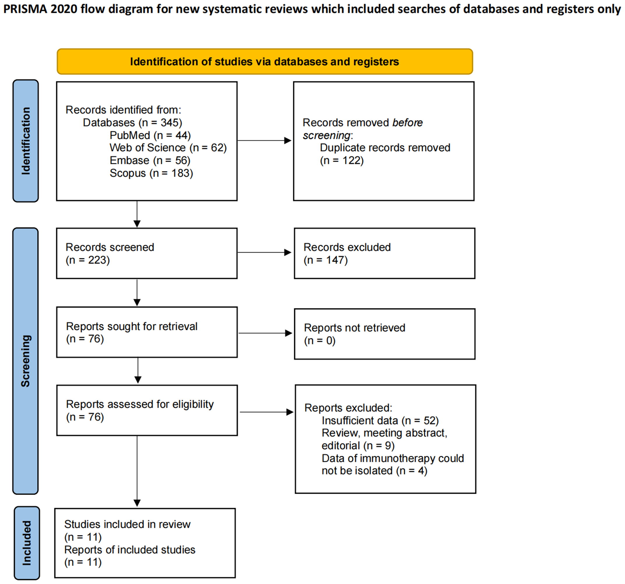 According to the relevant search terms and search strategies, 345 preliminary literatures were obtained in the computer database. After the preliminary de-duplicate, 223 records were selected, and the eligibility of 76 studies was further evaluated through careful review of the full text. Eleven retrospective studies were finally included in the meta-analysis (35–45). The detailed PRISMA flowchart for the literature screening is shown in Figure 1, and the checklist is shown in Supplementary File S3.