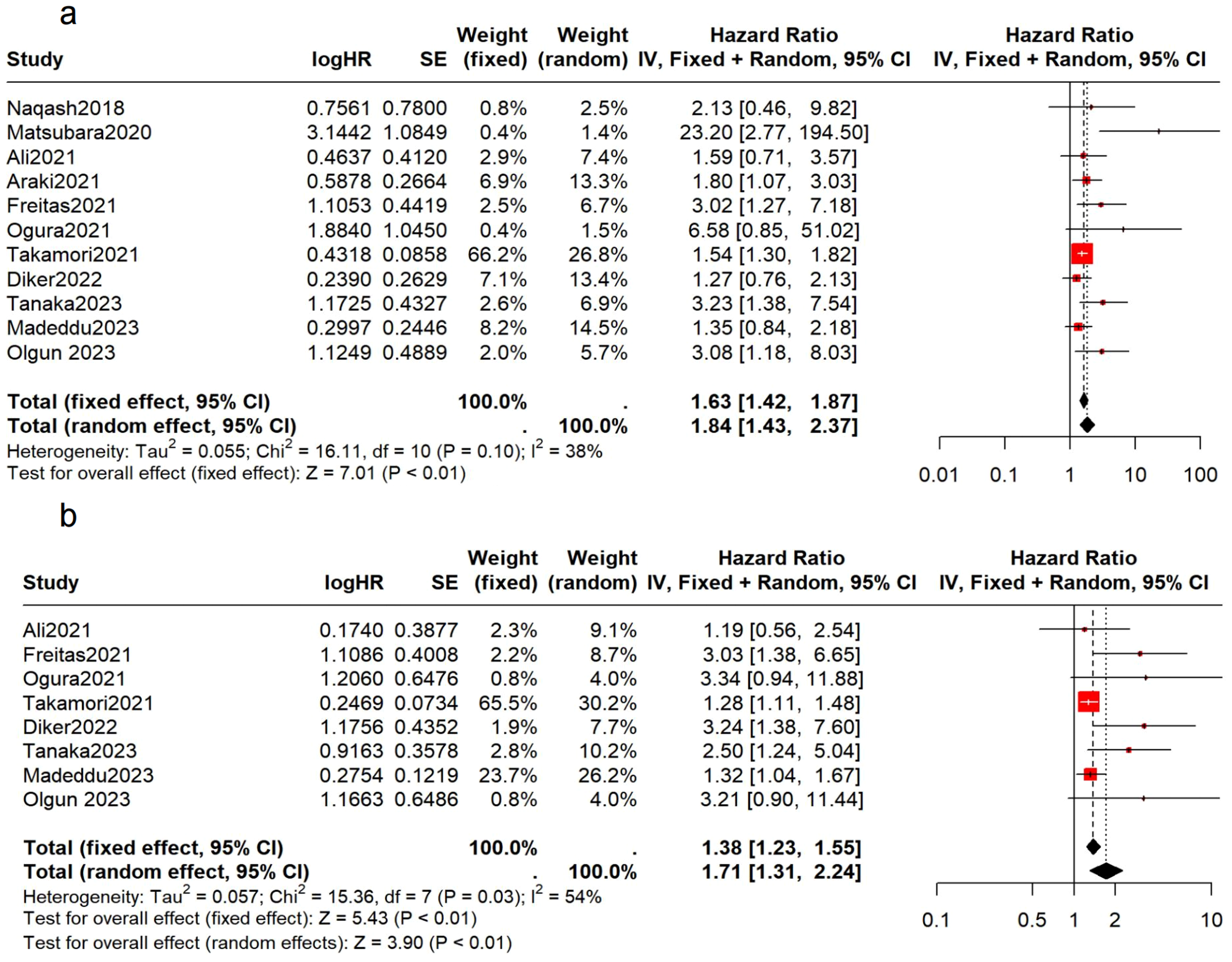 Preliminary analysis of 1,022 patients from 11 studies showed that patients with elevated mGPS prior to immunotherapy had poorer OS and PFS (OS: HR = 1.63, 95% CI: 1.42-1.87, p < 0.01, I² = 38%, p = 0.10; PFS: HR = 1.71, 95% CI: 1.31-2.24, p < 0.01, I² = 54%, p = 0.03) (Figure 2). The I² values indicate low to moderate heterogeneity, with non-significant p-values suggesting that the observed heterogeneity might be due to random variation.