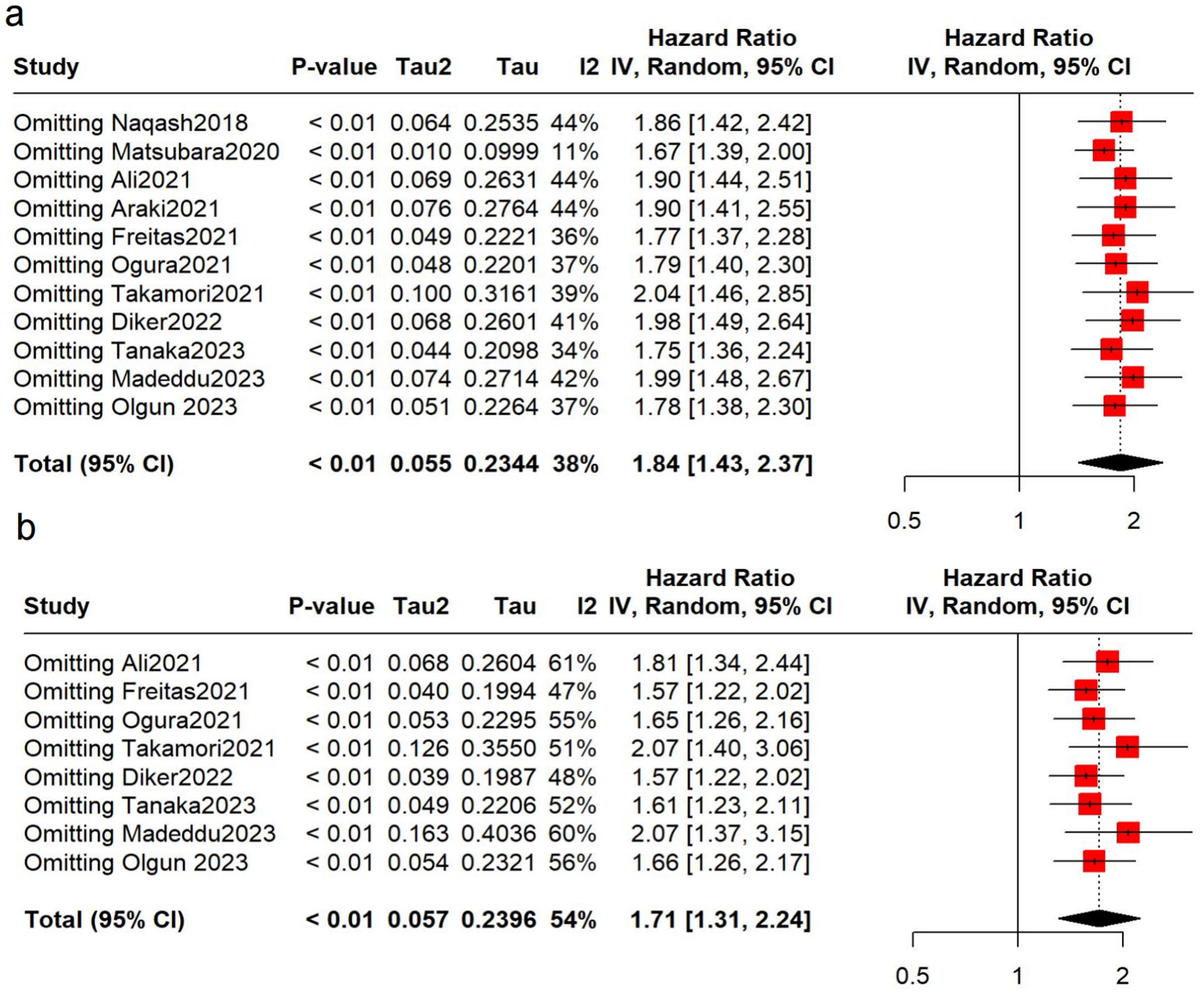 To verify the robustness of the results, sensitivity analyses were conducted. No over-representation of study was observed, and the pooled results remained robust (Figure 3). However, after removing the Matsubara study (34), we found that the heterogeneity decreased significantly (OS: I2 = 11%), suggesting that this may be a main contributor to the heterogeneity.
