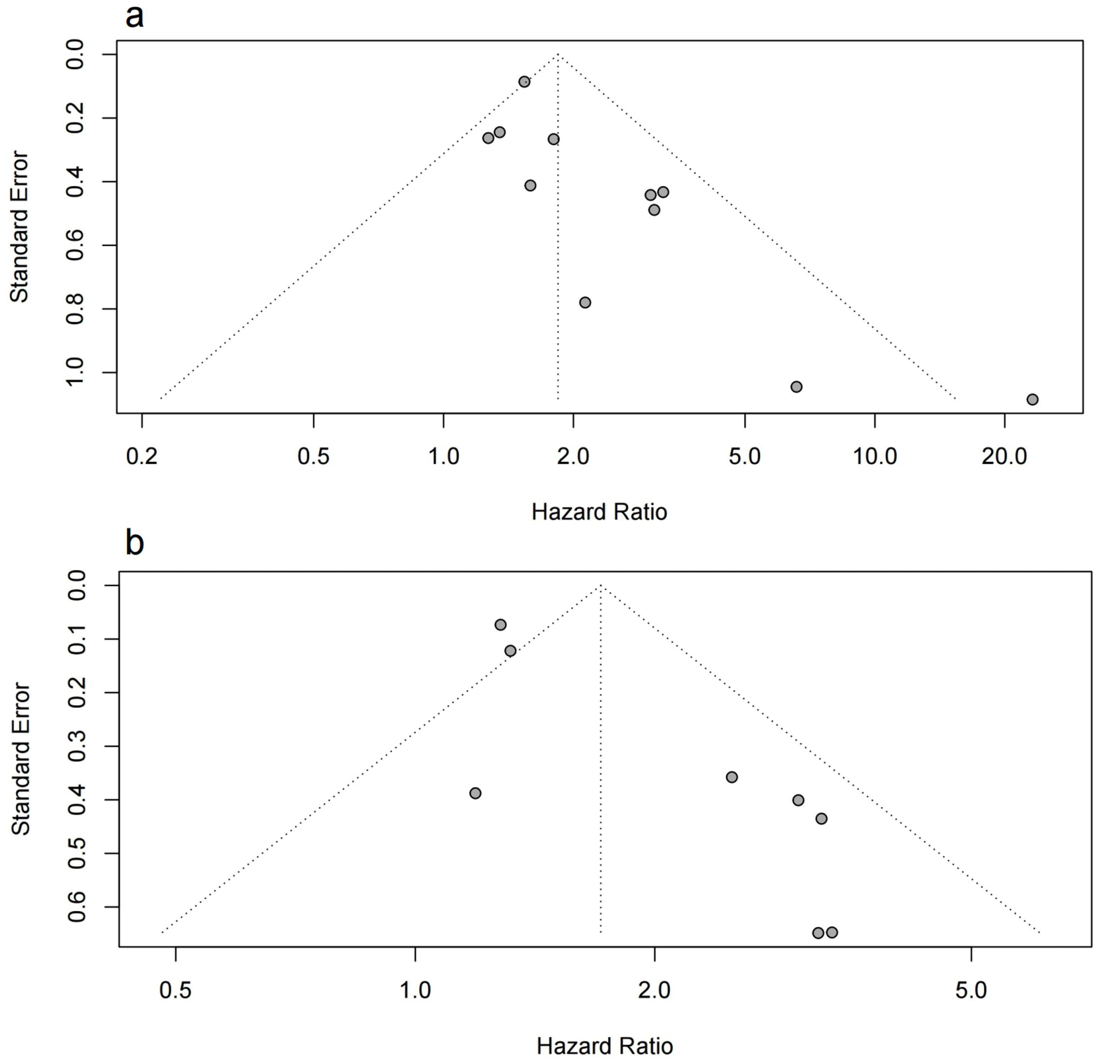 Asymmetry was observed in the funnel plot, indicating a potential publication bias (Figure 4). This was further supported by the Egger test results, which were statistically significant for both OS and PFS (p < 0.05). The asymmetry could be due to the selective publication of studies with positive results, which is a common issue in meta-analyses.