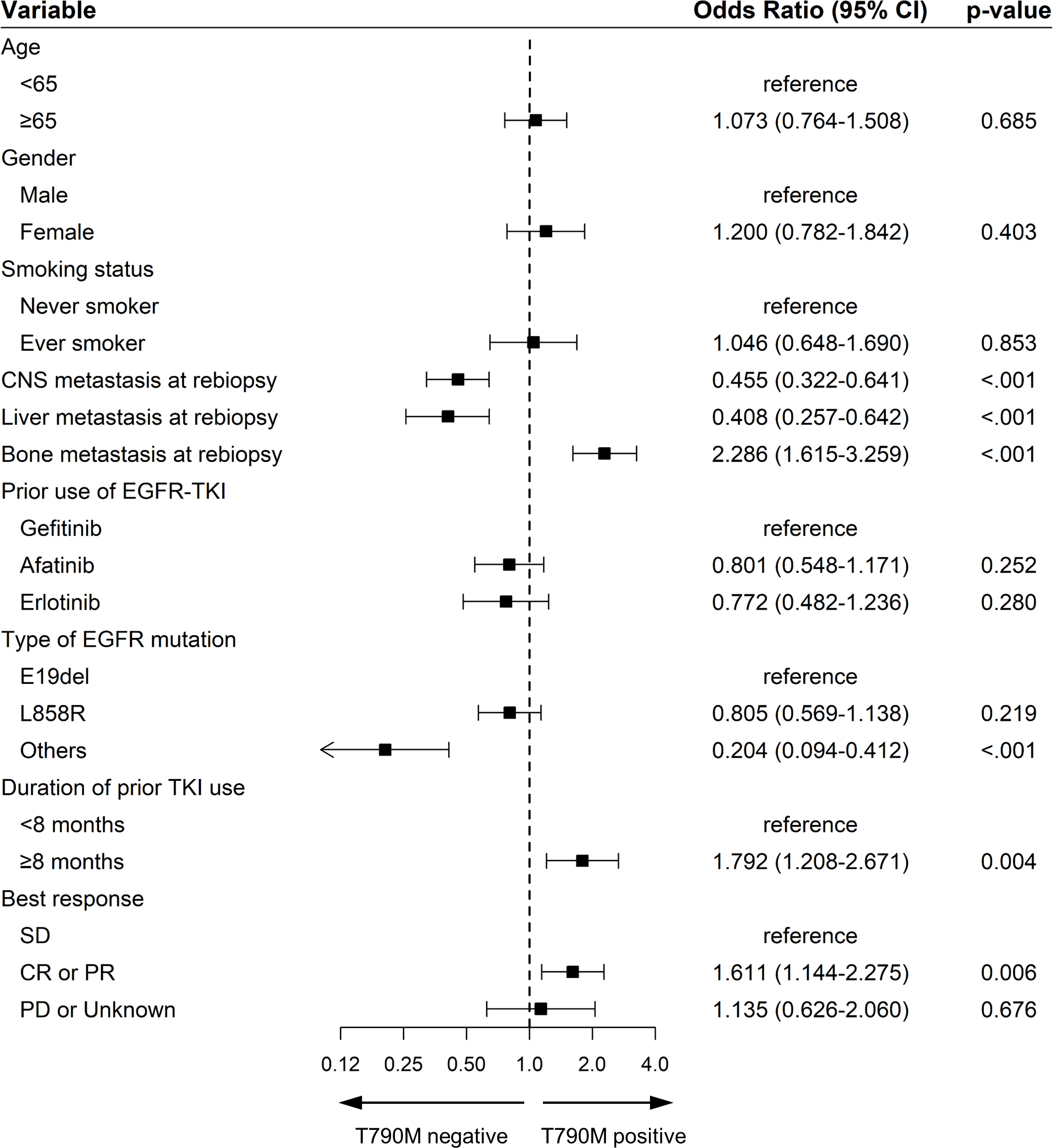 Patient characteristics were compared based on the presence or absence of the T790M mutation on rebiopsy after disease progression (Table 2). No significant differences in age, sex, or smoking status were observed between the two groups. However, a significant difference was observed in EGFR TKI treatment response and duration. The T790M-positive group had a longer median duration of previous EGFR inhibitor use (15.0 months vs 12.9 months, p=0.011) and better treatment response (CR or PR: 50.9% vs. 39.2%, p=0.036) compared to the T790M-negative group. Although there was no significant difference in the rate of extra-thoracic metastasis between the two groups, bone metastasis was significantly higher in the T790M-positive group (54.6% vs. 43.3%, p=0.004). Multivariate analysis revealed that the longer duration of initial EGFR TKI use (OR 1.792, with ≥8months compared to <8months, p=0.004), better EGFR TKI responses (OR 1.611, with CR or PR compared to SD, p=0.006), presence of bone metastasis (OR 2.286, p<0.001) were correlates with a higher rate of T790M positivity (Figure 2).