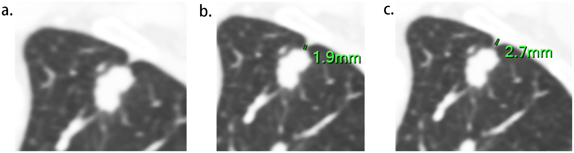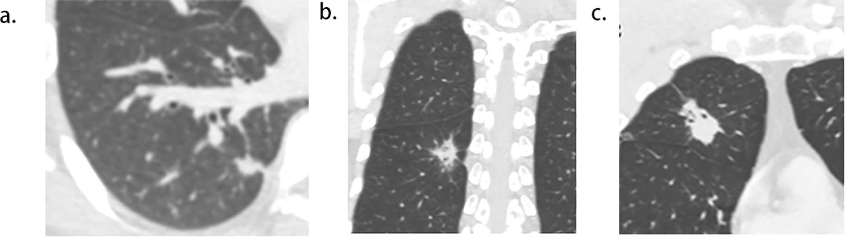 Tumor size was measured on the slice displaying the lesion’s maximum diameter on lung windows. The location, morphology (regular or lobulation), presence of bronchial obstruction, and vacuole sign were also documented. Bronchial obstruction was noted when bronchi were disrupted at the tumor’s proximal margin. The vacuole sign was identified when a small (less than 5 mm) round lucency or tubular lucency was observed within the tumor.