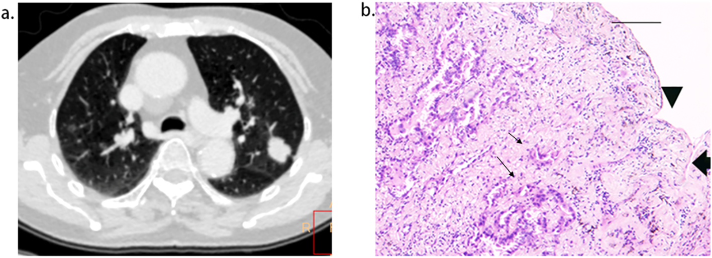 spiral CT, pleural invasion, lung adenocarcinomas, iodine uptake, pleural tag, tumor invasiveness