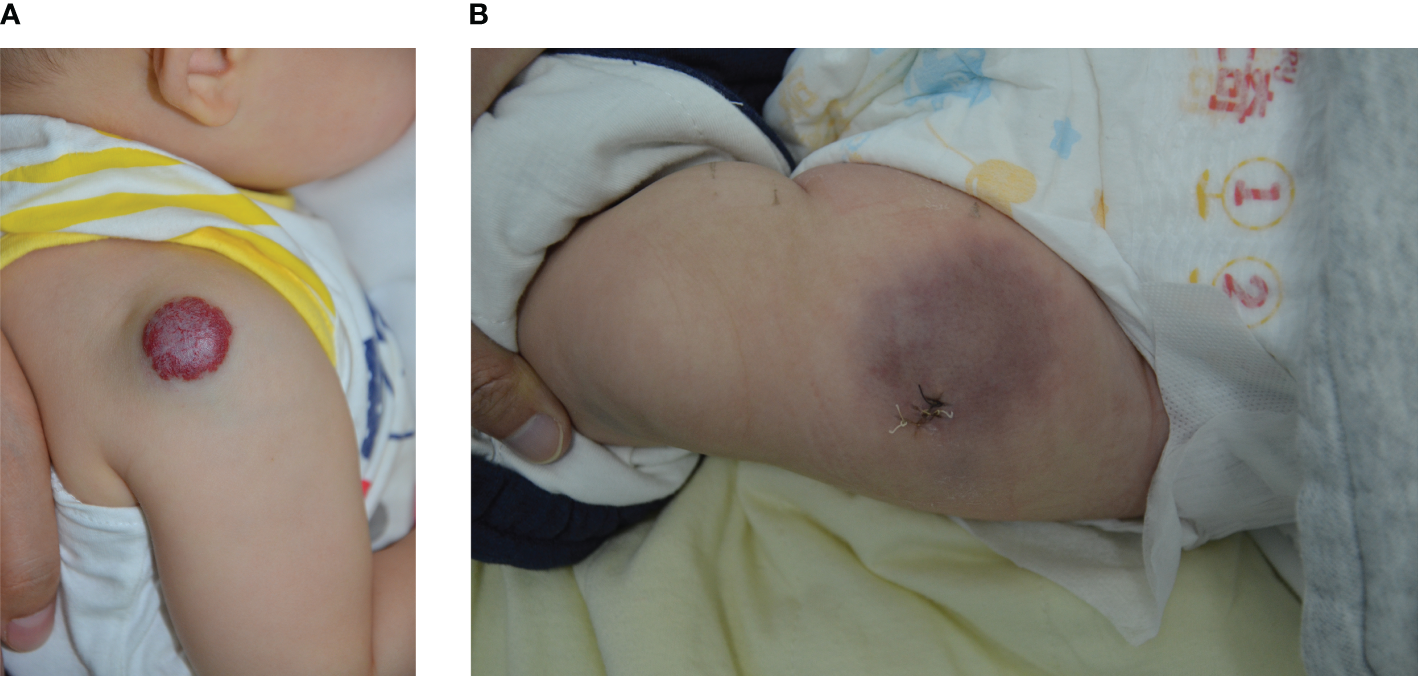 (A) Male, 6 months old, with a mixed IH on the right shoulder; (B) Female, 5 months old, with KHE on the anterior aspect of the left thigh.