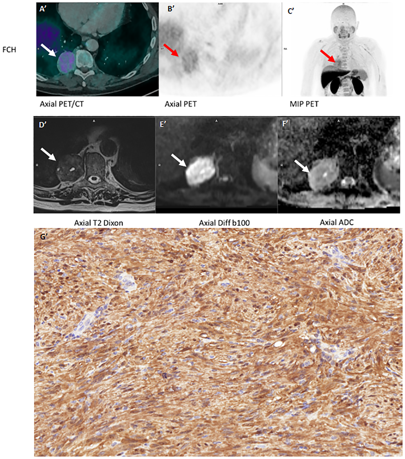 FCH PET/CT (A', B', C') MRI (D', E', F') and (G') (schwanomma histology).