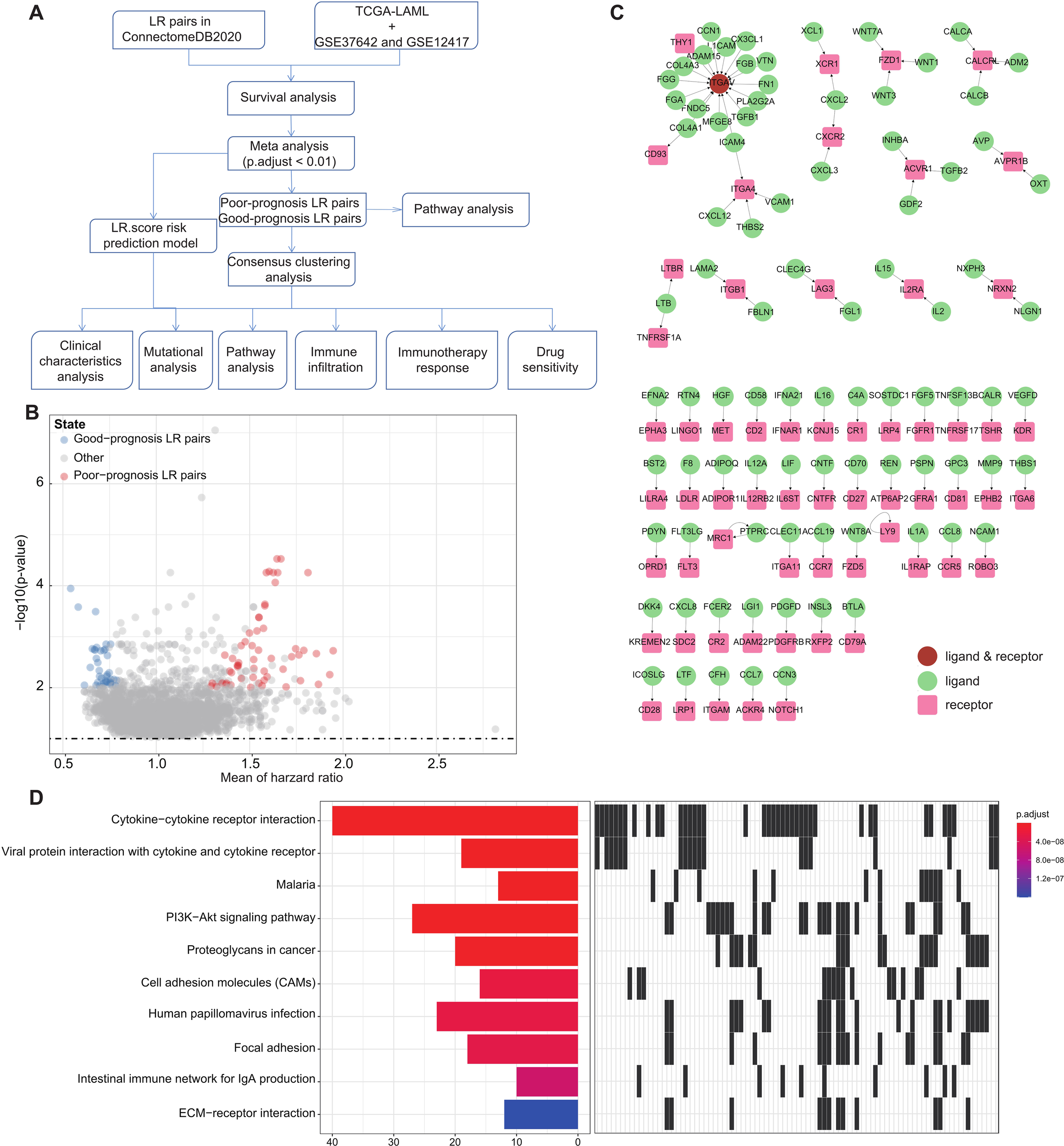 LR pairs with prognostic significance (A). Overview of the study’s workflow (B). Volcano plot representations highlight LR pairs with significant prognostic implications. LR genes associated with favorable prognosis are denoted in red, while those linked to poor prognosis are illustrated in blue (C). Network visualization of the significant prognostic LR pairs, with receptors showcased in red and ligands in green (D). The top ten enriched KEGG pathways derived from the prognostic-relevant LR pairs are presented.