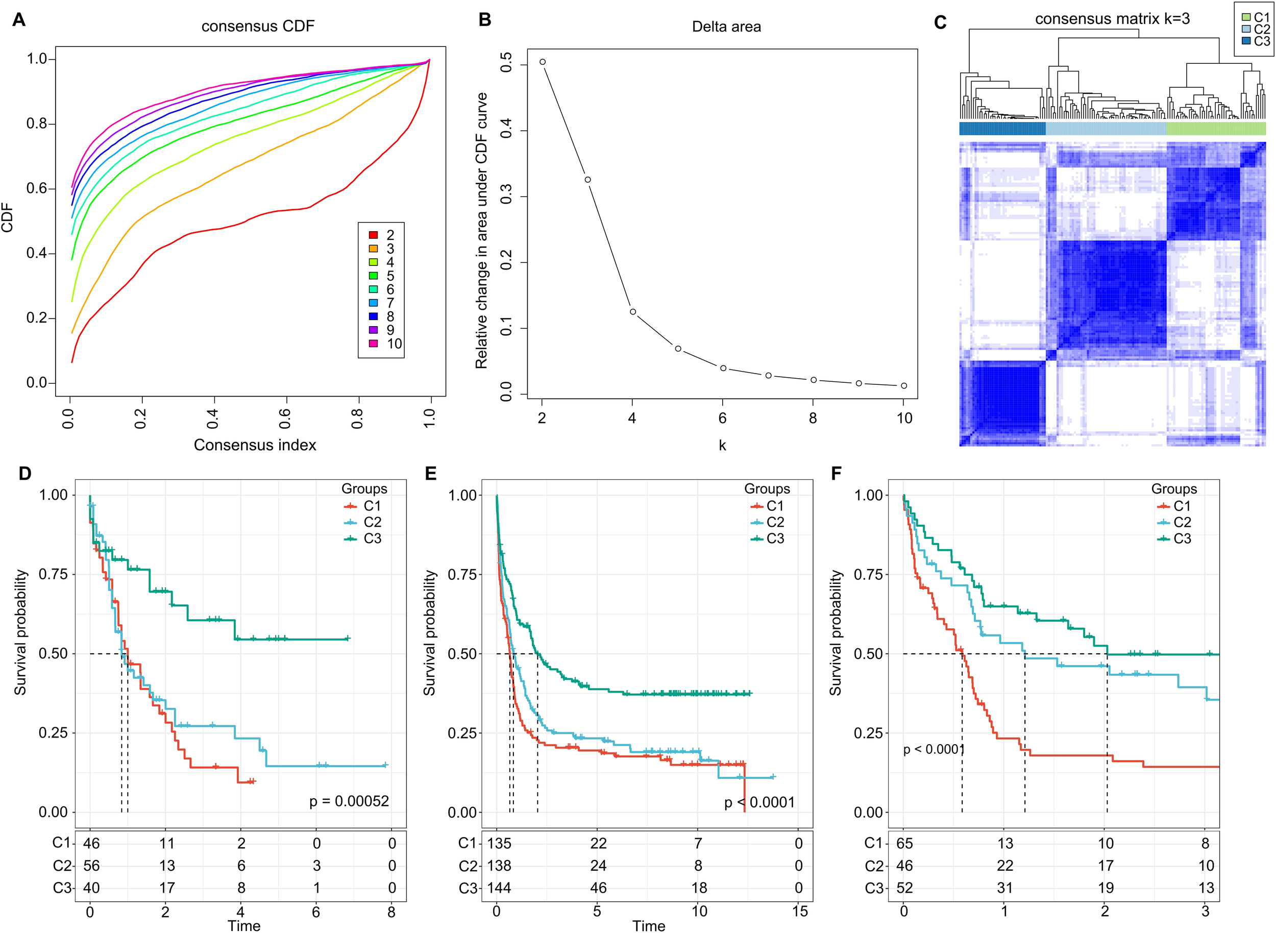 Cluster Analysis and Survival Outcomes Based on LR Pairs. (A) Consensus clustering using LR pairs and CDF curves from the consensus clustering in the TCGA dataset. (B) Delta area plot from the consensus clustering in the TCGA dataset. (C) Consensus matrices showcasing the identified clusters (k = 3). (D) Overall survival Kaplan-Meier plot for the three subtypes in the TCGA cohort (P = 0.00052, log-rank test). (E) Overall survival KaplanMeier plot for the three subtypes in the GSE37642 dataset (P< 0.0001, log-rank test). (F) Overall survival Kaplan-Meier plot for the three subtypes in the GSE12417 dataset (P< 0.0001, log-rank test).