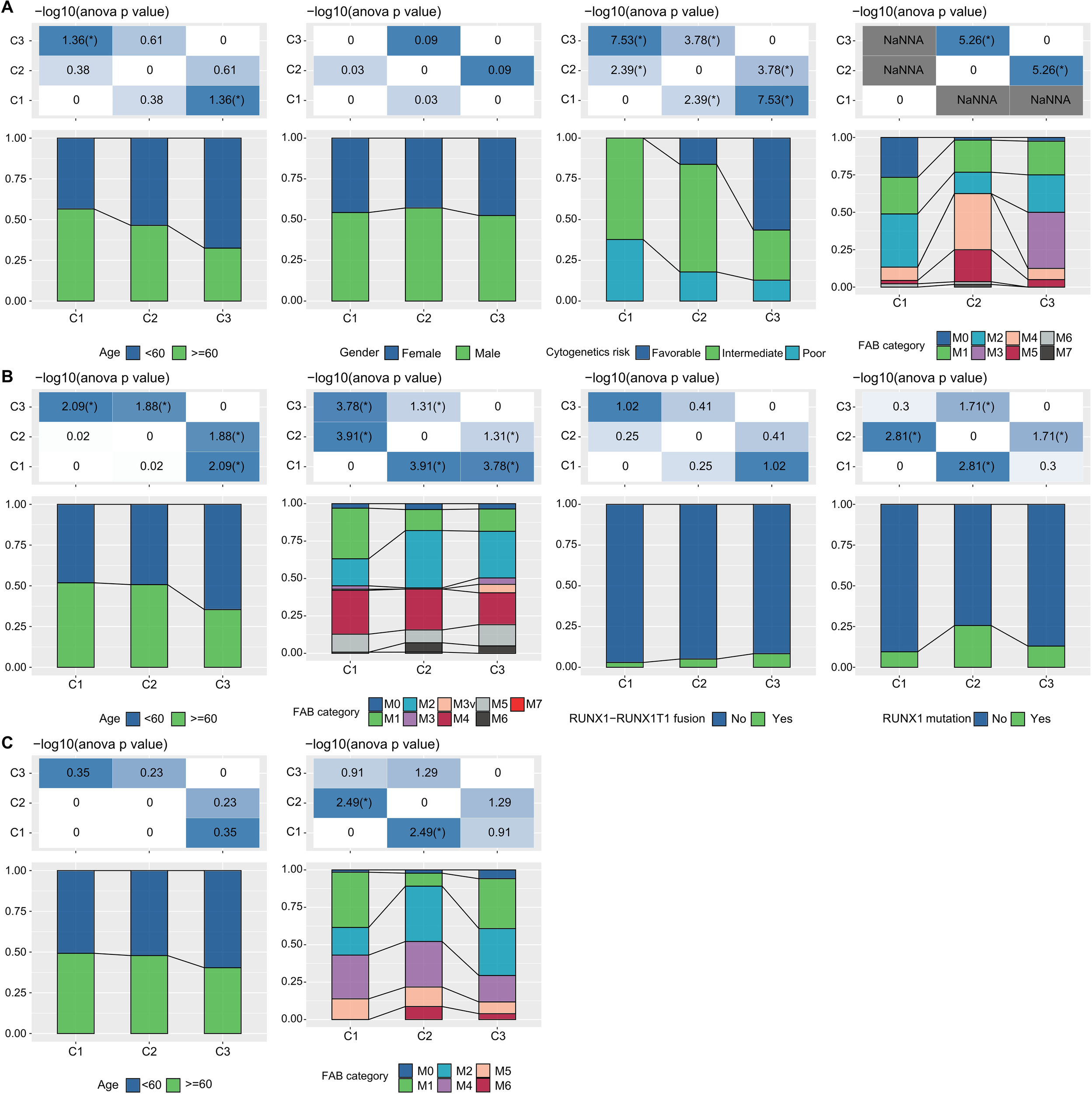 Additionally, in the TCGA dataset, we compared the distribution of various clinical pathological features across the three molecular subtypes to examine if these features varied among the subtypes. We found that there were differences in “age” groups, “CALGB Cytogenetics Risk Category,” and “FAB Category” among the three molecular subtypes. Specifically, the C1 subtype had a significantly higher proportion of older patients compared to the C3 subtype (Fisher’s exact test, -log10 P-value = 4.74). Most patients in the C3 subtype fell into the “Favorable” (Fisher’s exact test, -log10 P-value = 7.53) (Figure 3A). Similarly, we examined differences in clinical information among different molecular subtypes in the GSE37642 and GSE12417 cohorts (Figures 3B, C). We observed that the majority of patients did not have RUNX1 mutations. These analyses further support the notion that these molecular subtypes not only have prognostic value but also correlate with various clinical and pathological features, thereby potentially aiding in more targeted treatment approaches.