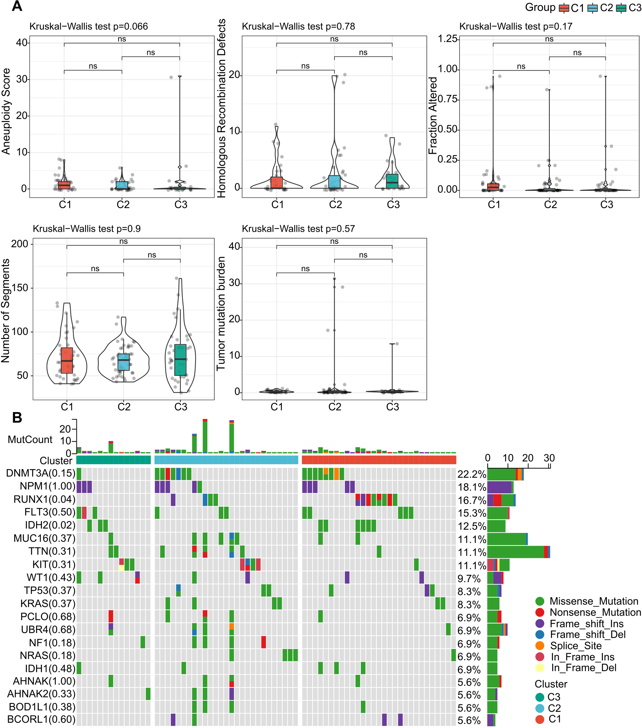 Genomic Variation Patterns Across LR Pair-Defined Clusters. (A) Analysis of parameters such as aneuploidy score, homologous recombination deficits, segment count, fraction of alterations, and tumor mutation burden within the LR pair-based clusters. Significance levels: ns, P > 0.05; *P < 0.05; **P < 0.01; ***P < 0.001. Kruskal-Wallis test employed. (B) Mutation profile showcasing the top 20 prevalent mutations across 142 AML patients. The top panel provides a count of mutations for each individual, whereas the bar chart below denotes the LR pair-defined clusters. An accompanying legend depicts various genetic mutation types and their occurrences.