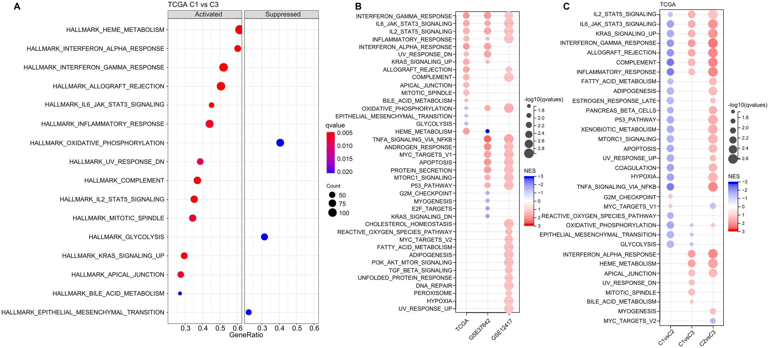 Next, we investigated whether there were differentially activated pathways within the various molecular subgroups. To identify these pathways, we performed Gene Set Enrichment Analysis (GSEA) using all candidate gene sets from the Hallmark database, with FDR threshold less than 0.05 for significant enrichment. In the TCGA cohort, when compared to the C3 subtype, the C1 subtype exhibited activation of 13 pathways and suppression of 3 pathways, as shown in (Figure 5A). These pathways were mainly related to immune responses, such as INTERFERON_GAMMA_RESPONSE, INFLAMMATORY_RESPONSE, INTERFERON_ALPHA_RESPONSE, ALLOGRAFT_REJECTION, and COMPLEMENT. In addition, we analyzed the significant enriched gene sets in the two validation cohorts when comparing the C1 subtype with the C3 subtype. Generally, activated pathways primarily included immune markers, such as INTERFERON_GAMMA_RESPONSE, IL6_JAK_STAT3_SIGNALING, IL2_STAT5_SIGNALING, and INFLAMMATORY_RESPONSE (Figure 5B). Furthermore, we compared differential pathways between C1 and C2, C1 and C3, as well as C2 and C3 in TCGA cohort. As shown in (Figure 5C),