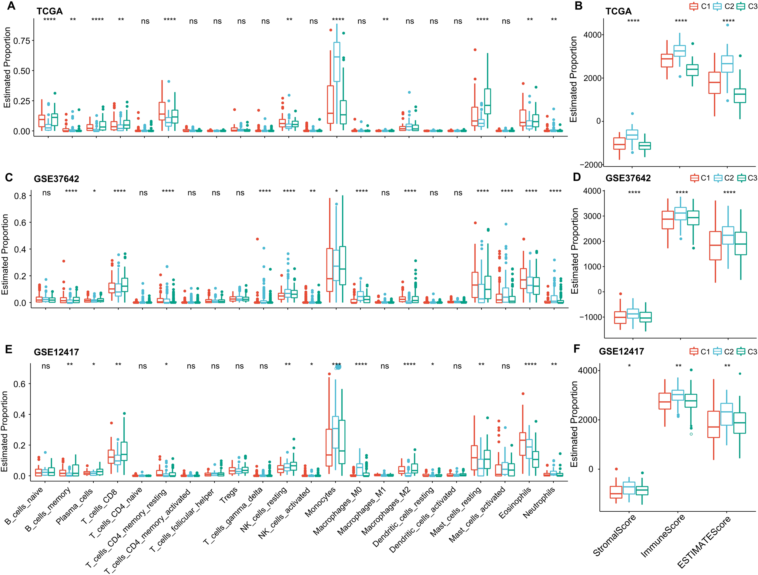 To delve deeper into the variations in the immune microenvironment across patients from different molecular groups, we assessed the relative proportions of 22 immune cell types across the three AML cohorts using the CIBERSORT algorithm. This revealed pronounced differences in the presence of specific immune cells across the three molecular subtypes (as illustrated in (Figures 6A, C, E). Notably, the C3 subtype exhibited elevated levels of CD8 T cells and plasma cells, suggesting heightened adaptive immune responses. Additionally, we employed the ESTIMATE algorithm to assess immune cell infiltration, as shown in (Figures 6B, D, F). We found that the “ImmuneScore” was consistently highest in the C2 subtype across the TCGA, GSE37642, and GSE12417 cohorts, indicating a relatively higher level of immune cell infiltration in the C2 subtype, importantly, C2 also has highest myeloid lineage cells compare to C1 and C2.