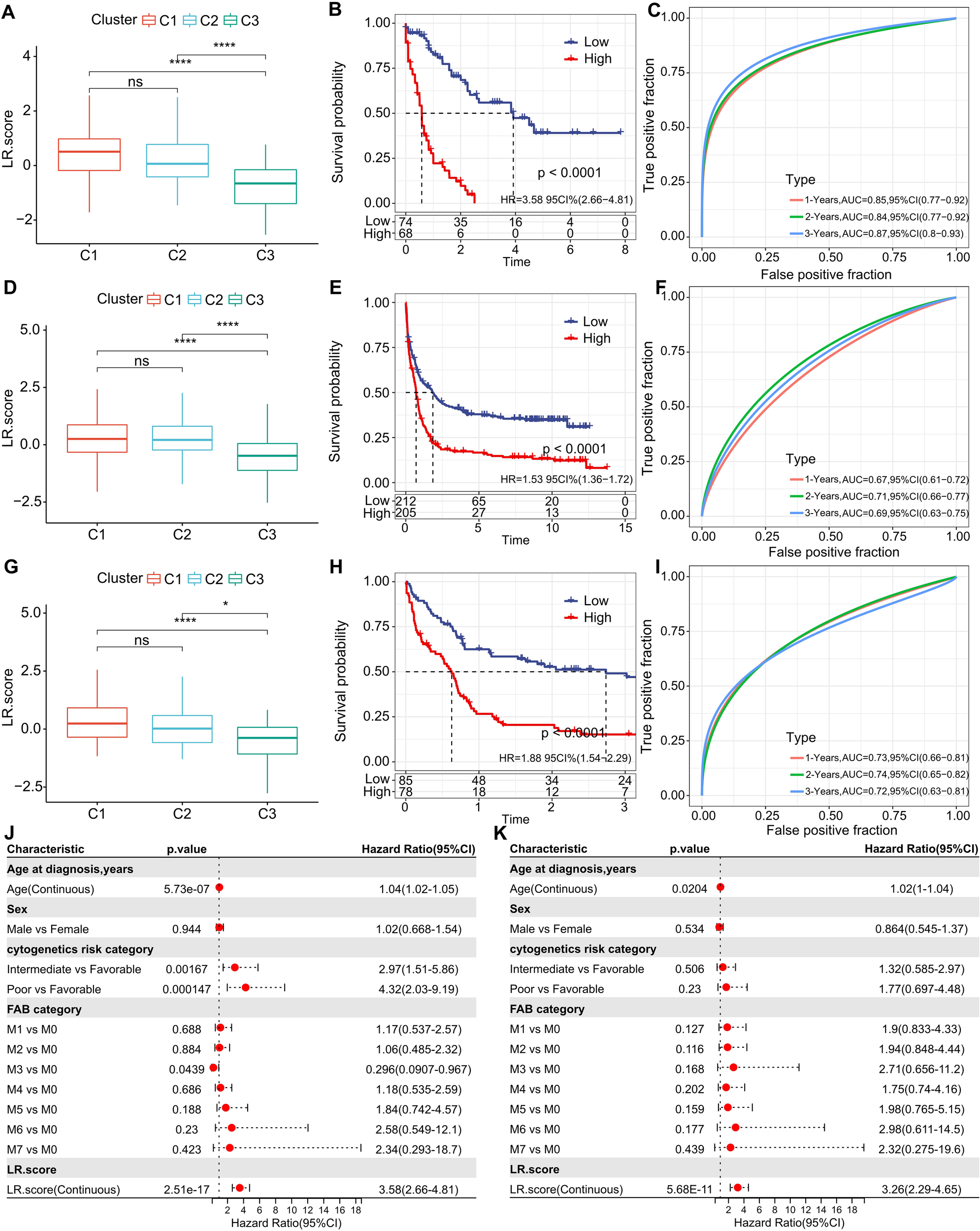 Understanding the LR.score Across Cohorts. (A) Variability in LR.score among the TCGA-LAML cohort. (B) Survival comparison between high and low LR.score groups in TCGA-LAML. (C) Predictive accuracy of LR.score in the TCGA-LAML cohort for 1, 2, and 3-year survival. (D-I) Similar analyses conducted for GSE37642 and GSE12417 cohorts. (J, K) Univariate and multivariate Cox regression model analyses factoring in LR.score, age, gender, cytogenetics risk, FAB category, and outcomes in the TCGA-LAML cohort.