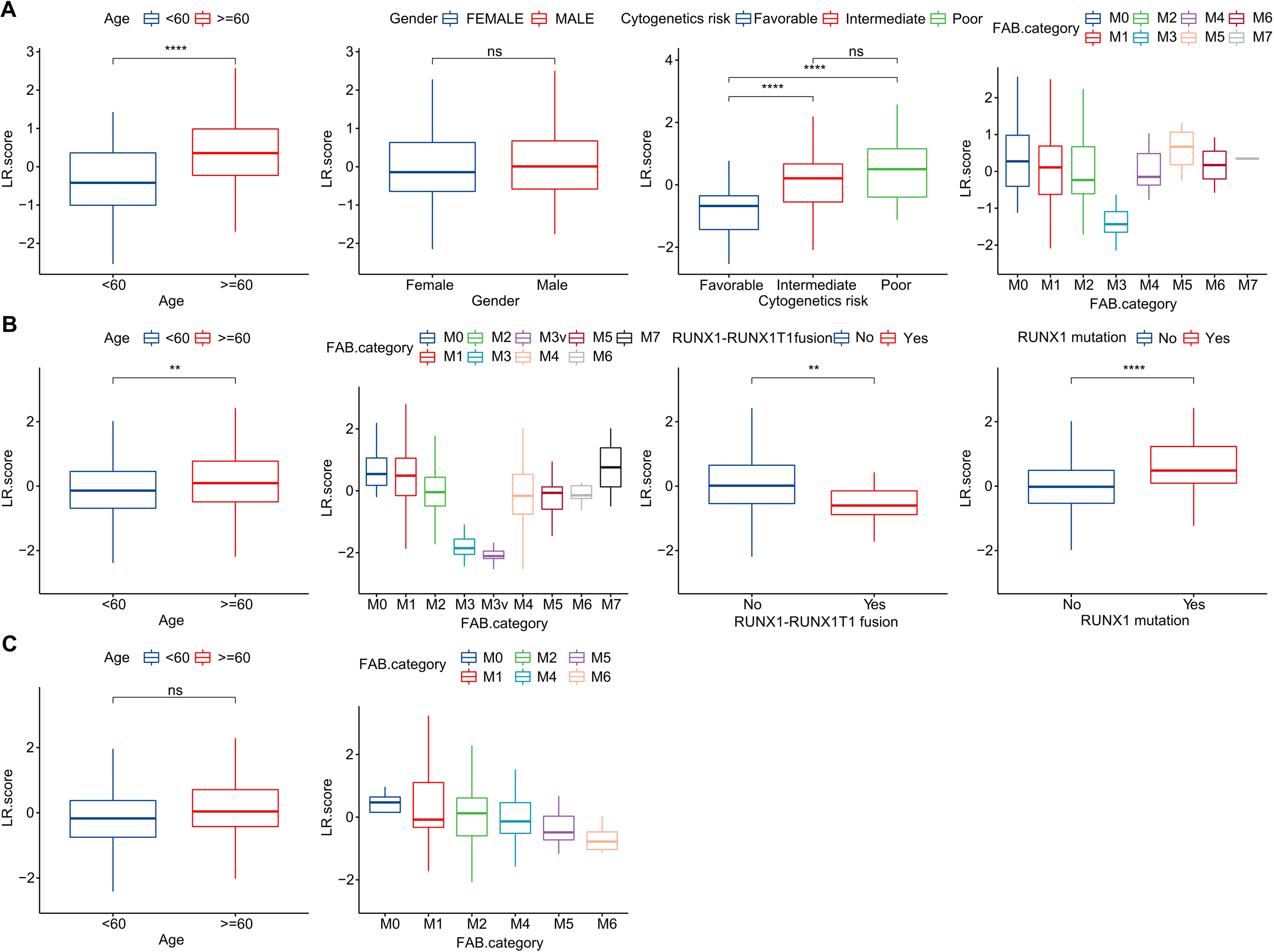 Clinical Implications of the LR.score. (A–C) Distribution of LR.score concerning various clinical-pathological features across TCGA-LAML, GSE37642, and GSE12417 cohorts. Significance denoted as: ns, P > 0.05; ** P < 0.01; ****P < 0.0001. Analyzed using the Wilcoxon rank-sum test.