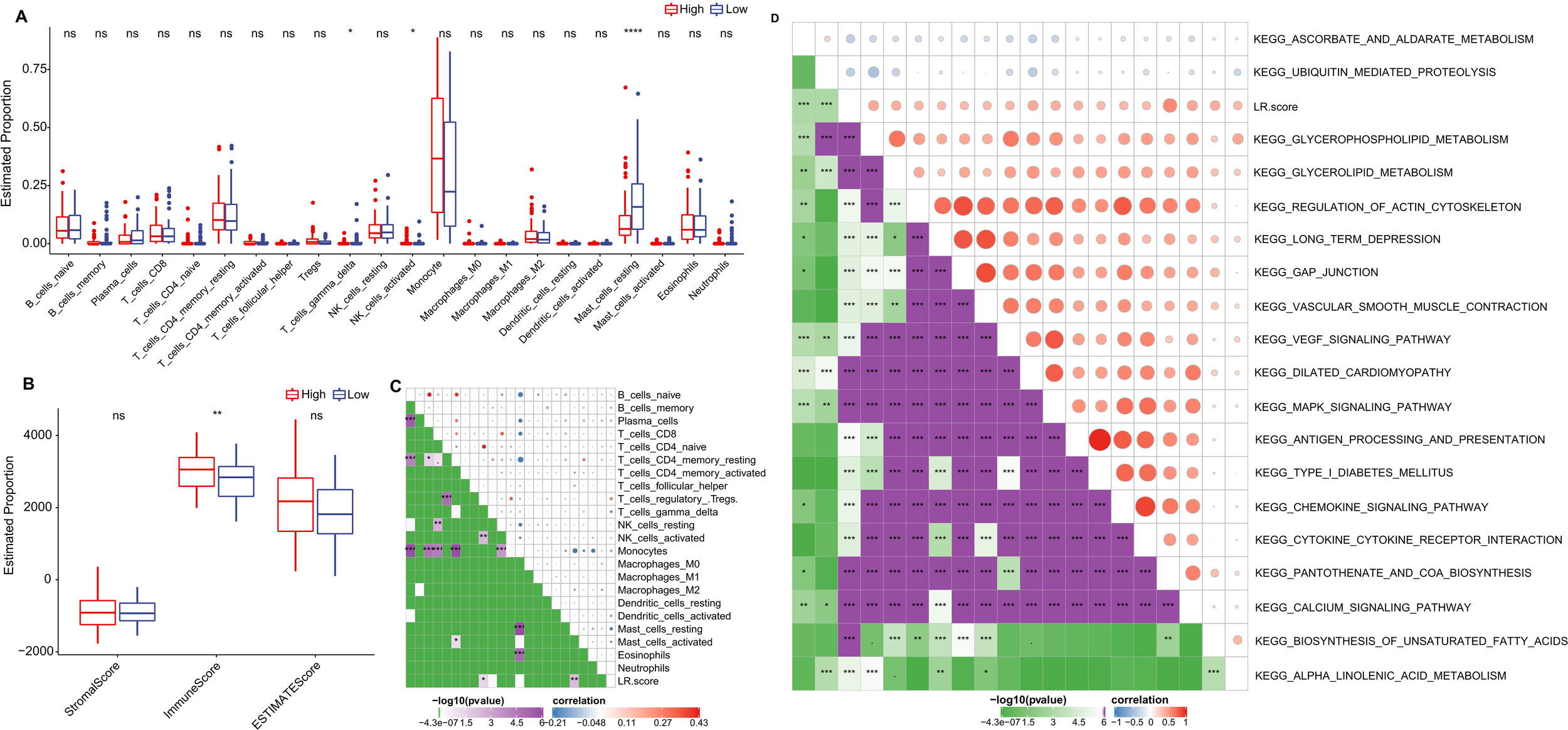 Role of LR.score in Immune Infiltration and Pathway Activation. (A, B) Distribution of immune cell types and stromal-immune scores between high and low LR.score groups in the TCGA-LAML cohort. (C, D) Correlation analyses between immune cell components, KEGG pathways, and the LR.score.