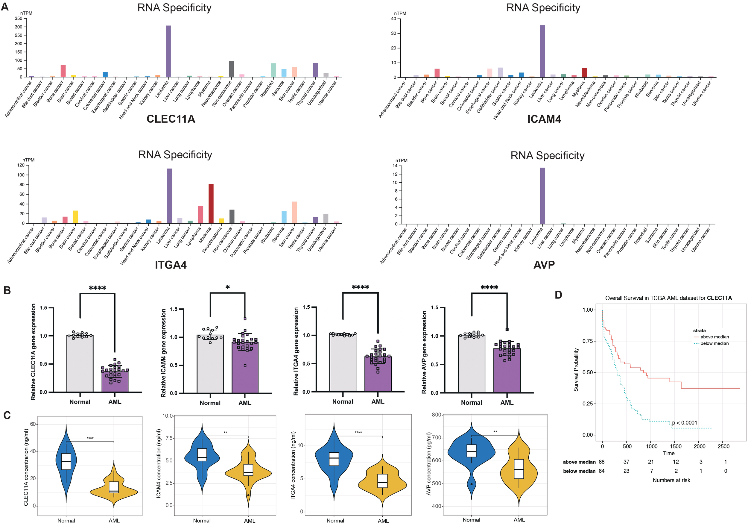 LR.score model validation. (A) Cancer specificity of CLEC11A, ICAM4, ITGA4, and AVP expressions among pan-cancer. (B) qRT-PCR of CLEC11A, ICAM4, ITGA4, and AVP comparing normal and AML bone marrows. Significance denoted as: *P< 0.05; ****P< 0.0001. Analyzed using the unpaired t test. (C) ELISA concentration of CLEC11A, ICAM4, ITGA4, and AVP comparing normal and AML bone marrows. Significance denoted as: **0.001< P< 0.01; ****P< 0.0001. Analyzed using the unpaired t test. (D) Overall survival Kaplan-Meier plot for high- and low- CLEC11A expressions in the TCGA dataset (P< 0.0001, log-rank test).