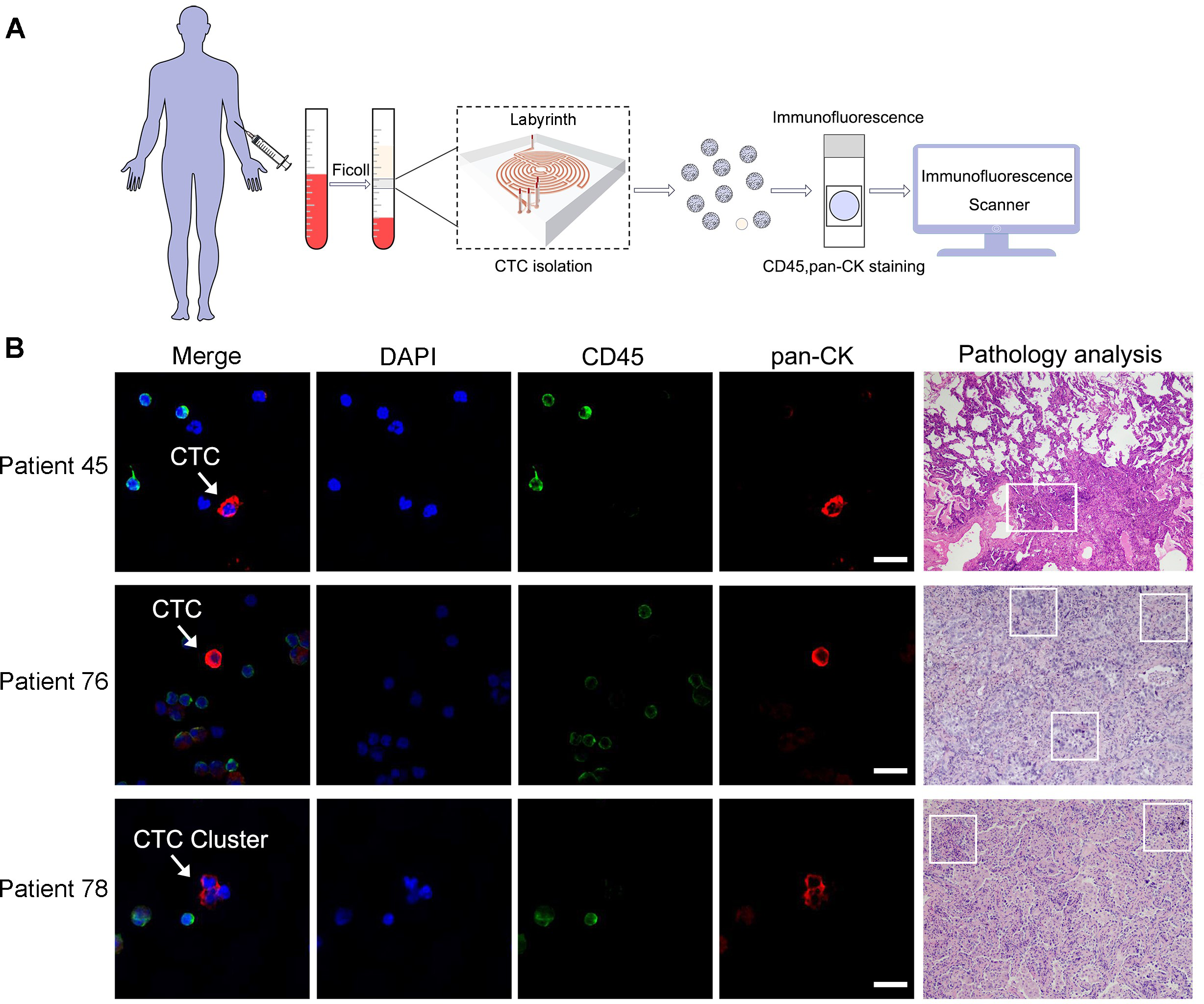 CTCs isolation and identification by Labyrinth system. (A) Procedures for CTCs detection from enrolled participants by Labyrinth system. (B) Representative views of CTCs and their corresponding pathological results from the same LC patients were obtained. CTCs from patient 45 and patient 76, as well as a CTC cluster from patient 78, were stained using DAPI, pan-CK, and an antibody against CD45. DAPI is on blue channel. The antibody against CD45 is on green channel and pan-CK is on red channel. The highlighted CTC and CTC clusters are pan-CK+/CD45-/DAPI+. White blood cells are pan-CK-/CD45+/DAPI+. Scale bar represents 10µm. Box areas in the patient’s pathological results indicate the presence of LC.