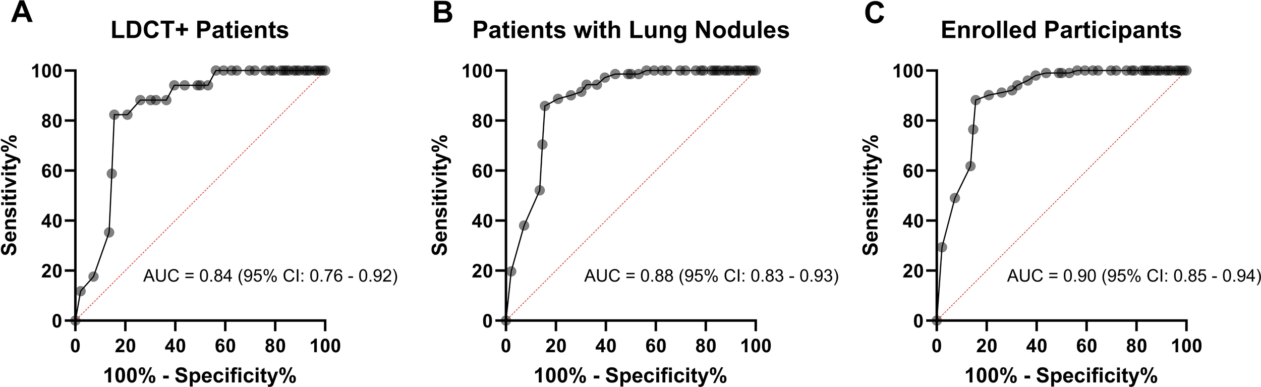 The ROC curve analysis was based on the data plotted in Figures 3B–D as well. In Figure 4A, the area under curve (AUC) is 0.84 (95% CI: 0.76-0.92) among LDCT+ patients. The AUC increased to 0.88 (95% CI: 0.83-0.93) among patients with lung nodules, as presented in Figure 4B. Furthermore, an even higher AUC of 0.90 (95% CI: 0.85-0.94) was observed for all enrolled participants, as shown in Figure 4C.