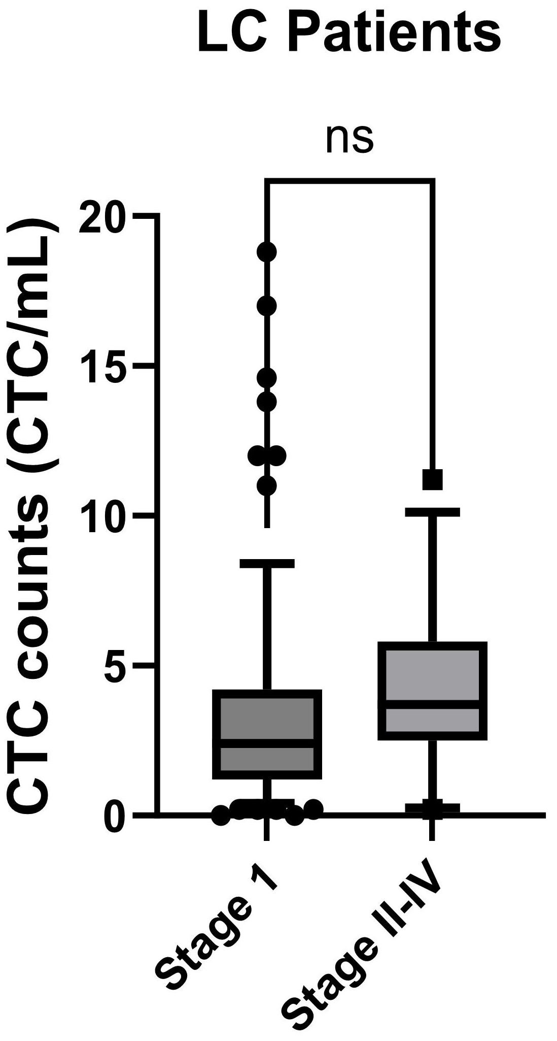 CTC counts for LC patients at different TMN stages were compared. Stage I patients were compared to the stage II-IV patients and analyzed using the KS test. Box-and-whiskers plots at 10-90% were used for the figure. p-Value was displayed (ns: p-Value > 0.05).