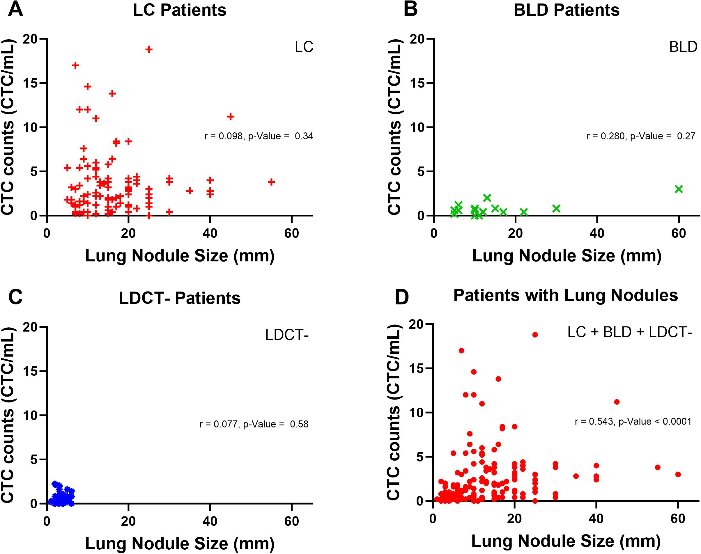 We pursued further investigation to delve into the potential correlation between lung nodule size and CTC counts by nonparametric spearman correlation.CTC counts from patients with lung nodules were plotted against nodule size, measured by the largest diameter of one or more nodules in each patient. In Figure 6A, among LC patients, no correlation between lung nodule size and CTC counts was observed, with a spearman r and p-Value of 0.098 and 0.34. Similarly, no correlation was found for BLD and LDCT- patients, with p-Values of 0.27 and 0.58, respectively in Figures 6B, C. However, when all patients with lung nodules, including LC, BLD and LDCT- groups were analyzed together in Figure 6D, the result indicated a modest correlation between lung nodule size and CTC counts, yielding a spearman r value of 0.543 and a p-Value < 0.0001.