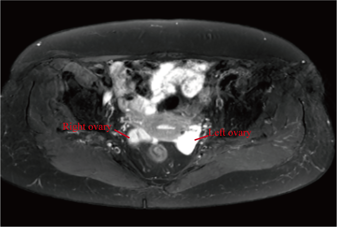 Upon admission, an MRI examination was conducted on the patient, revealing bilateral adnexal area cystic abnormal signal (cystadenoma not excepted) (Figure 1), uterine fibroids. Serum tumor markers were within normal ranges, and chest CT and ECG showed no abnormalities. During the gynecological examination, no obvious masses were palpable in the adnexal regions. Preoperative diagnosis was bilateral ovarian tumors and uterine fibroids. Subsequently, the patient underwent surgery, specifically laparoscopic total hysterectomy and bilateral salpingo-oophorectomy. Intraoperatively, both ovaries were noted to be slightly enlarged, approximately 3.5cm in diameter, with granular protrusions on the surface (Figure 2), and both fallopian tubes showed changes consistent with post-ligation. There was no pelvic adhesion or fluid, and the upper abdomen was unremarkable. The intraoperative rapid pathology report indicated a multilocular cystic lesion in both ovaries, with some areas lined by flattened epithelium and fibrous collagenous cyst walls, showing relatively mature differentiation. The surgery proceeded smoothly, and postoperative supportive treatments including anti-inflammatory measures were administered. Considering the patient’s good recovery, she was discharged.