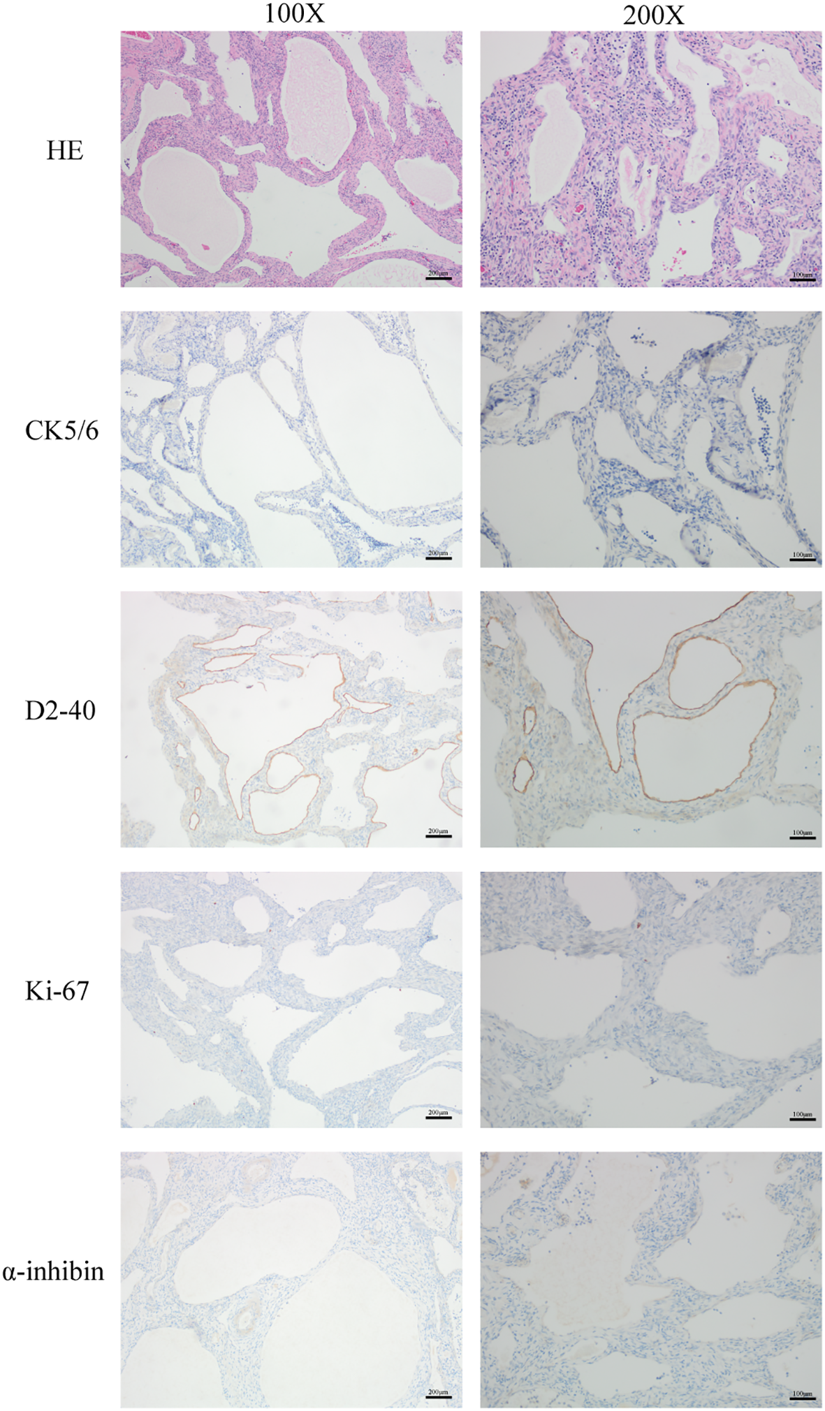 H&E staining was used to show the morphology and structure of the cells in this tumor tissue. The expression of CK5/6, D2-40, Ki67 and α-inhibin were determined by immunohistochemistry. Scale bar: 200 μm, magnification: 100X, Scale bar: 100 μm, magnification: 200X.