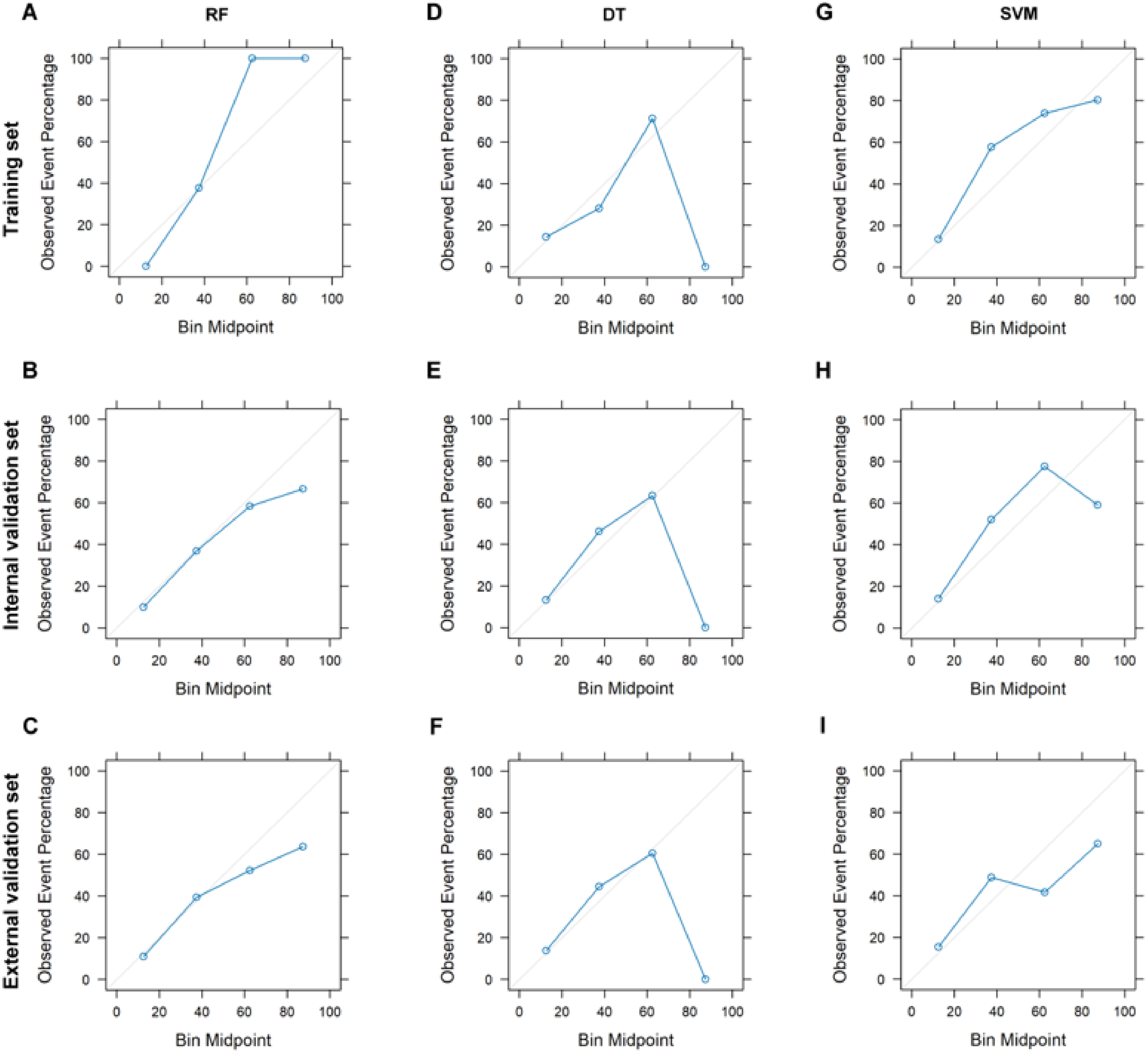 The calibration plots reveal that the RF model consistently aligns predicted probabilities with observed event frequencies, particularly within the medium to low probability range (Figures 3A–C), indicating its strong generalizability. Conversely, the DT model’s predictions generally match actual outcomes across most datasets but exhibit slight deviations in the external validation set (Figures 3D–F), suggesting potential overfitting and poor generalization to new data. The SVM model’s calibration remains close to the 45° line in both the training and validation sets, with minor deviations in certain probability intervals (Figures 3G–I), indicating good calibration and consistent performance across datasets. Additionally, decision curve analysis was used to assess the clinical utility of these models. The RF model demonstrated the highest net benefit across most threshold probabilities in the training set, while the DT and SVM models showed similar net benefits, both lower than that of the RF model (Supplementary Figure 4A). In the internal validation set, the RF model continued to show higher net benefit across most thresholds, with DT and SVM performing similarly and both lower than RF (Supplementary Figure 4B). Even though performance declined for all models in the external validation set, RF still outperformed DT and SVM across most thresholds (Supplementary Figure 4C).