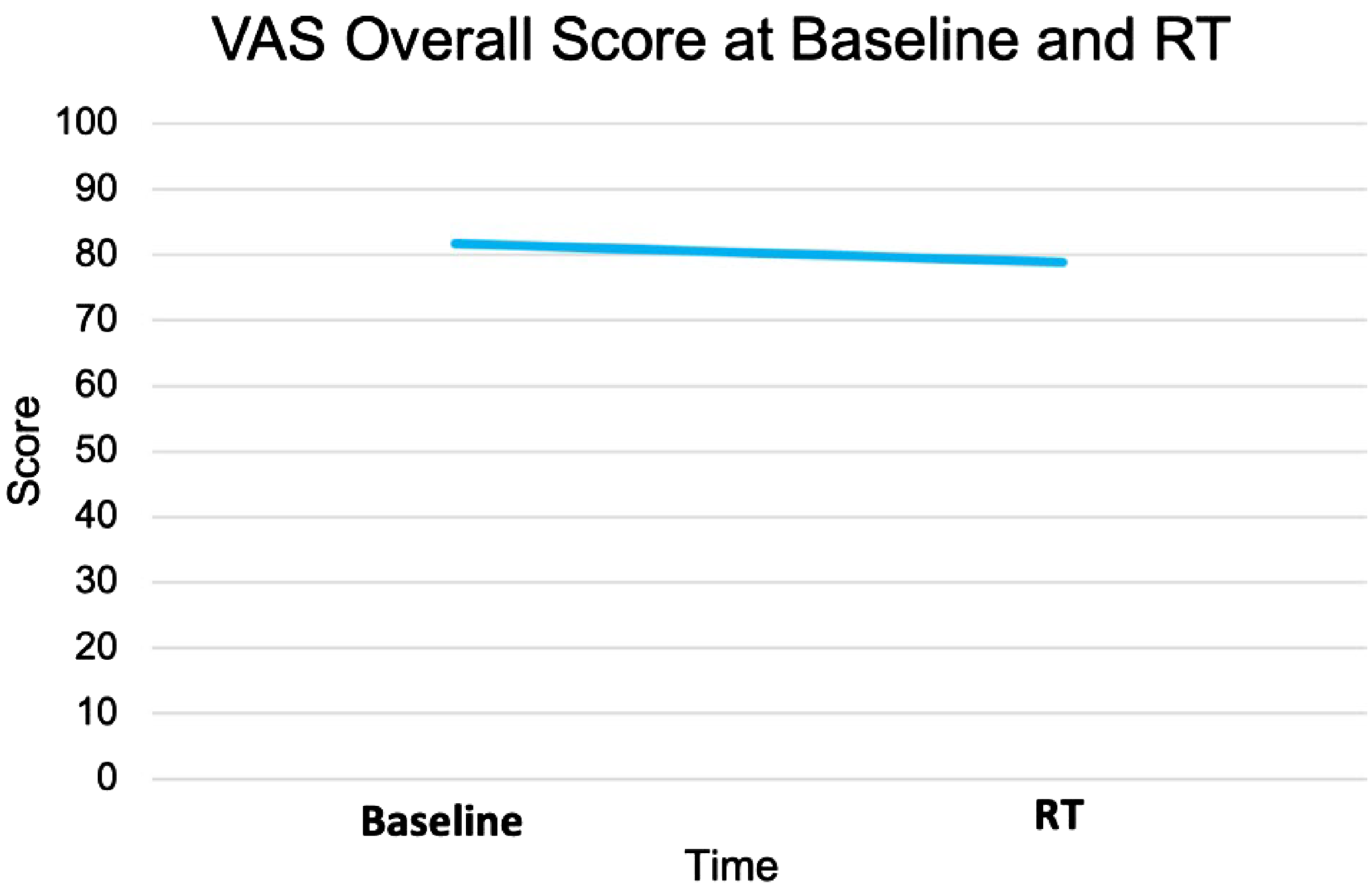 Results: Among the 87 patients, average age was 71 years, 42% were non-white, and 24% were considered obese (BMI ≥30 kg/m²). Relugolix was initiated a median of 4 months before SBRT initiation (IQR: 3.9–5.4), with 87% of patients reaching profound castration (<20 ng/dl). The VAS overall score was notably higher at baseline (mean ± SD: 82 ± 10) compared to the paired score before RT (79 ± 14, p = 0.02), although this difference was not clinically significant. No statistically or clinically significant changes were observed in any of the five individual items.