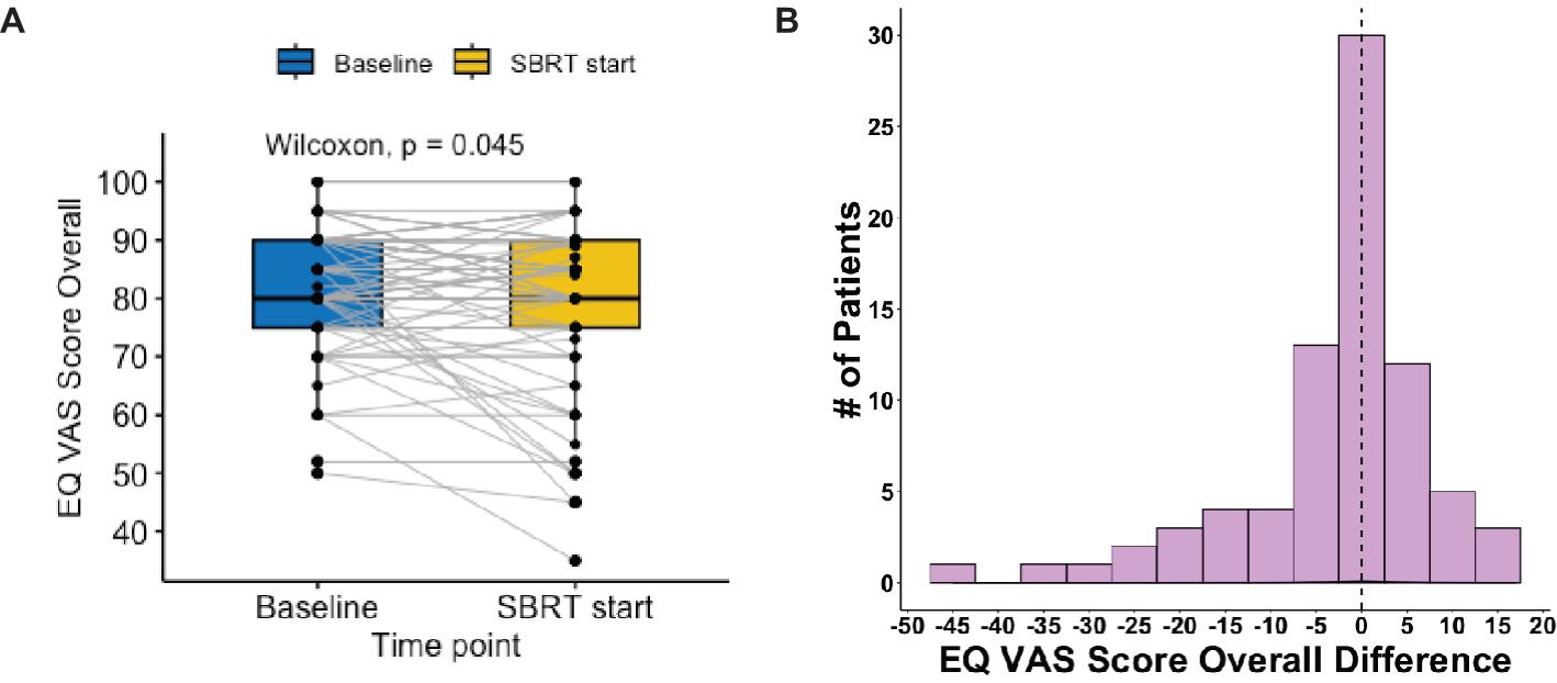 The EQ VAS score was statistically significantly higher at baseline (mean ± SD: 82 ± 10) than the paired score at the start of SBRT (79 ± 14, p = 0.02) (Table 2, Figure 3). This change was not clinically significant as evaluated by MID. The paired difference in VAS score overall between the two time points had a median of 0 (IQR: −5, 2.5) (Figure 4). Patients were divided into two groups, one group whose VAS score overall remained the same or increased (62%) versus the other whose score decreased (38%). These two groups had no statistically significant differences across demographic and clinical characteristics, as reported in Table 1.